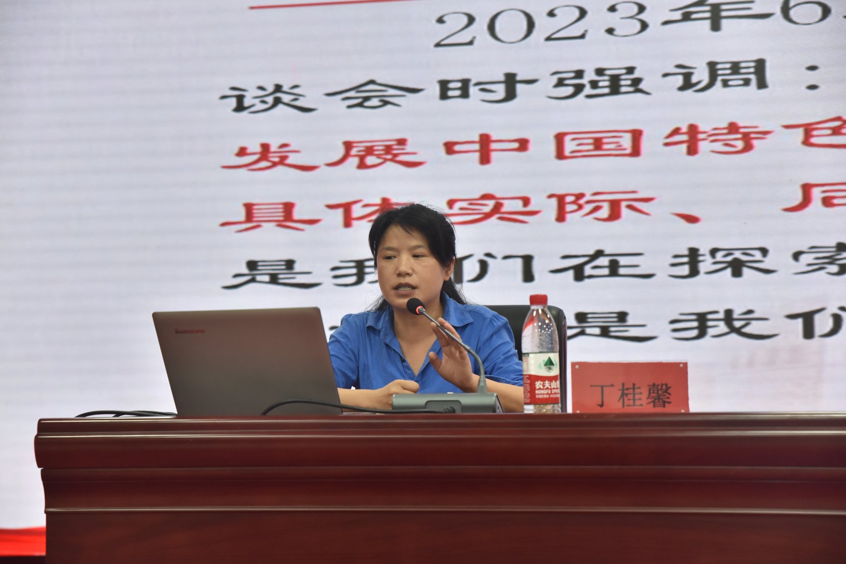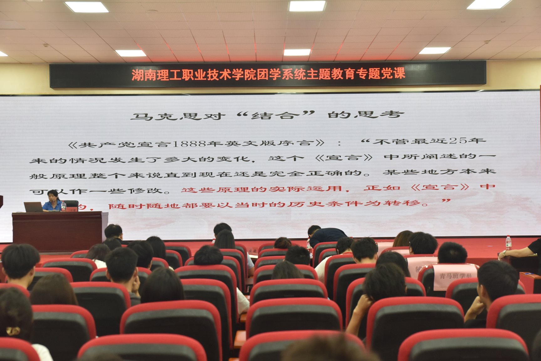 2023年6月13日下午,湖南理工职业技术学院举行了团学系统理论学习,我院教师丁桂馨博士应邀主讲。丁博士以《从“两个结合”的角度深入理解中国式现代化》为题,从为何推进“两个结合”、“两个结合”何以成功、“两个结合”的中国式现代化的基本特征为主线展开理论宣讲。全校党政办、学工保卫部、校团委主要负责人、各二级学院党总支副书记以及全体辅导员参加学习。整个讲座内容丰富,理论阐释与案例结合,获得与会者的一致好评。