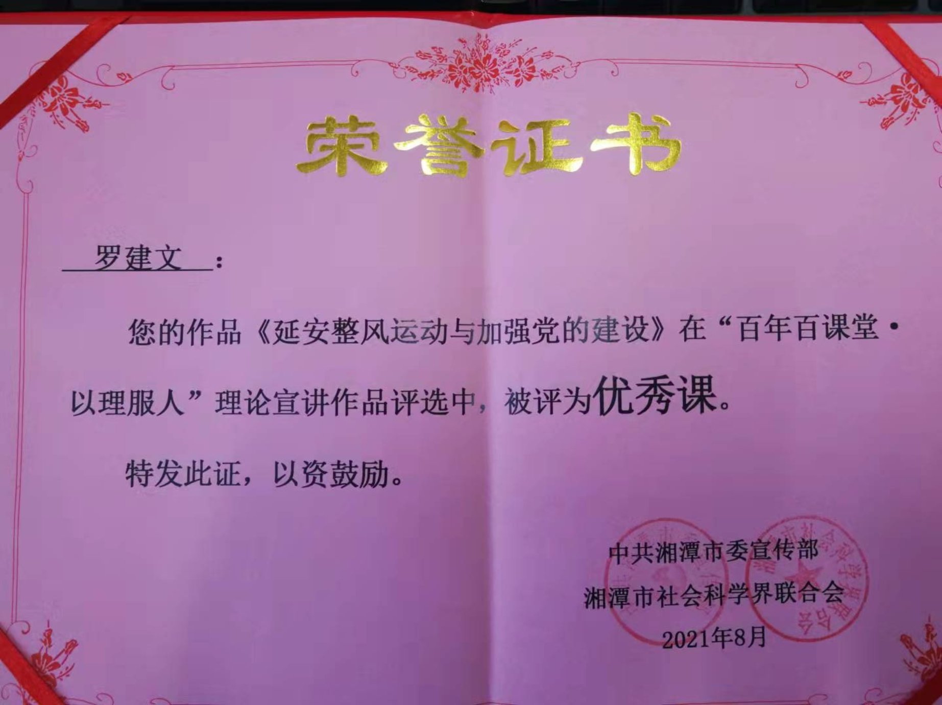 在中共湘潭市委宣传部和湘潭市社会科学界联合会共同主办的、为庆祝建党100周年“百年百课堂·以理服人”理论宣讲比赛中,我院博士生导师罗建文教授的作品《延安整风运动与加强党的建设》,在2021年湘潭市“百年百课堂·以理服人”理论宣讲作品评选中,被评为优秀课。本次活动是在中共湘潭市委党史学习教育领导小组办公室指导下,由中共湘潭市委宣传部、湘潭市社会科学界联合会共同主办。“百年百课堂·以理服人”理论宣讲活动启动以来,广大党员干部积极参与,用生动的语言、新颖的表达方式传递着“思想火炬”。
