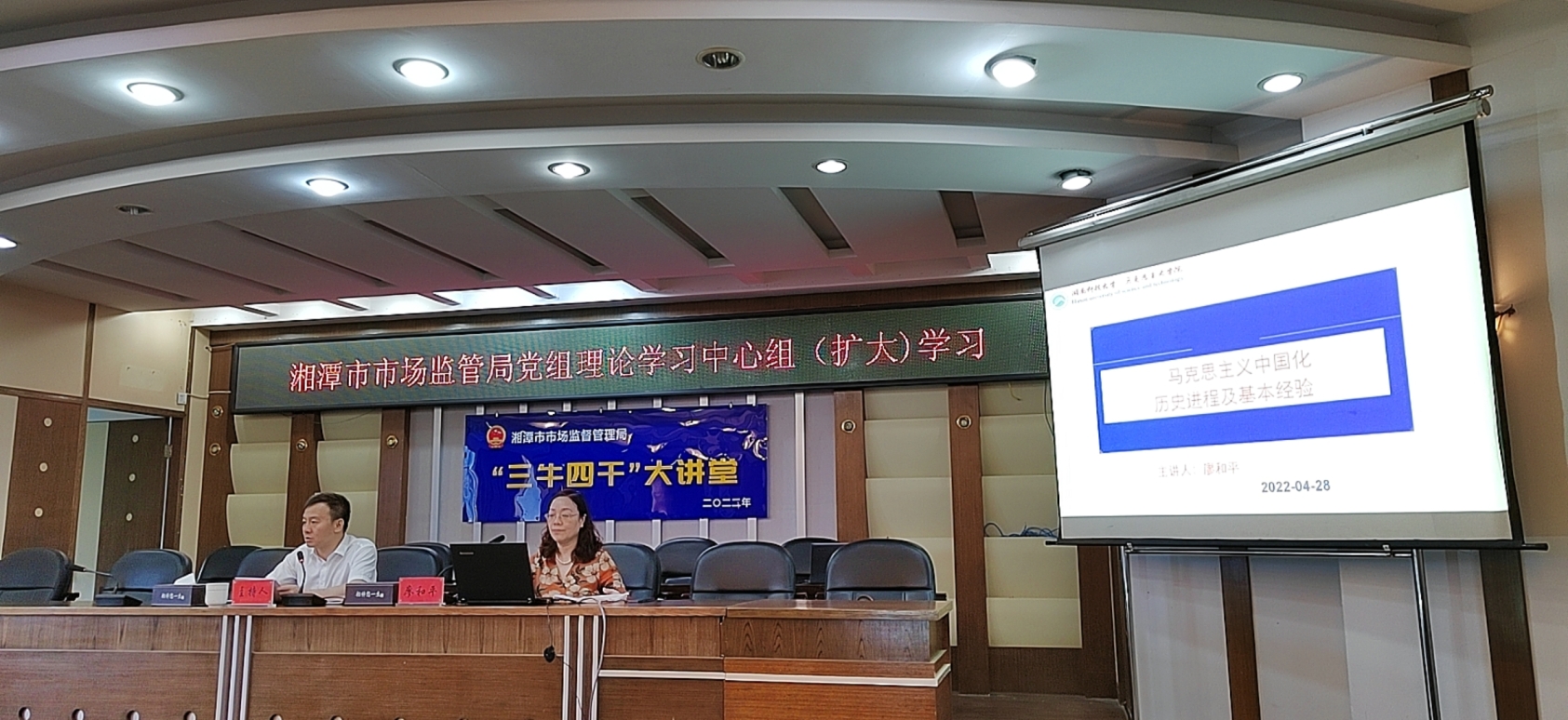 2022年4月28日,湘潭市市场监督管理局举行“三牛四干”大讲堂第一讲暨党组理论学习中心组(扩大)学习,特邀请我院廖和平教授作了一场题为“马克思主义中国化历史进程及基本经验”的专题报告。