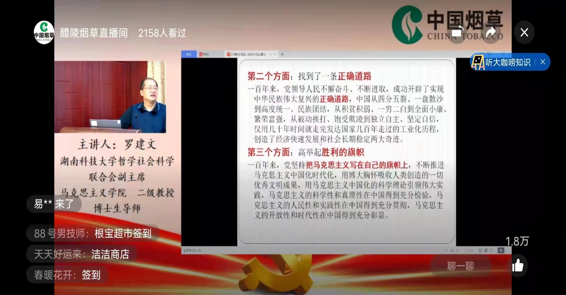 宣讲会从上午8点30分开始,一直到11点50分结束,全体与会人员仔细听取讲解,还认真做了学习记录。《醴陵烟草直播间》有许多听众在网上讨论和热议罗建文教授的这个宣讲报告。纪检组组长姜锴同志在会议总结讲话时,对罗建文教授的宣讲报告给予了高度评价,称是一个有丰富思想内涵、有厚重历史事实、有充分时代气息的宣讲报告;要求全局党员干部以此为契机,认真学习十九届六中全会精神,结合醴陵烟草行业的工作实际,将“学党史、办实事、讲政治、开新局”的党建理论学习活动持续深入地开展并落到实处。