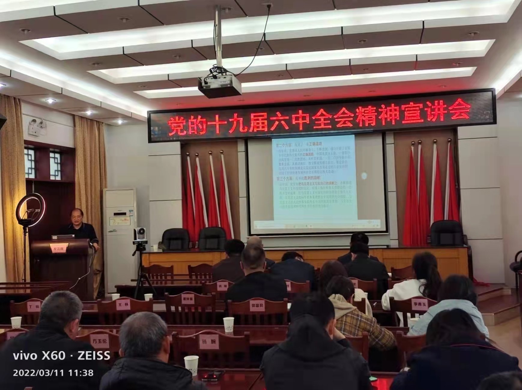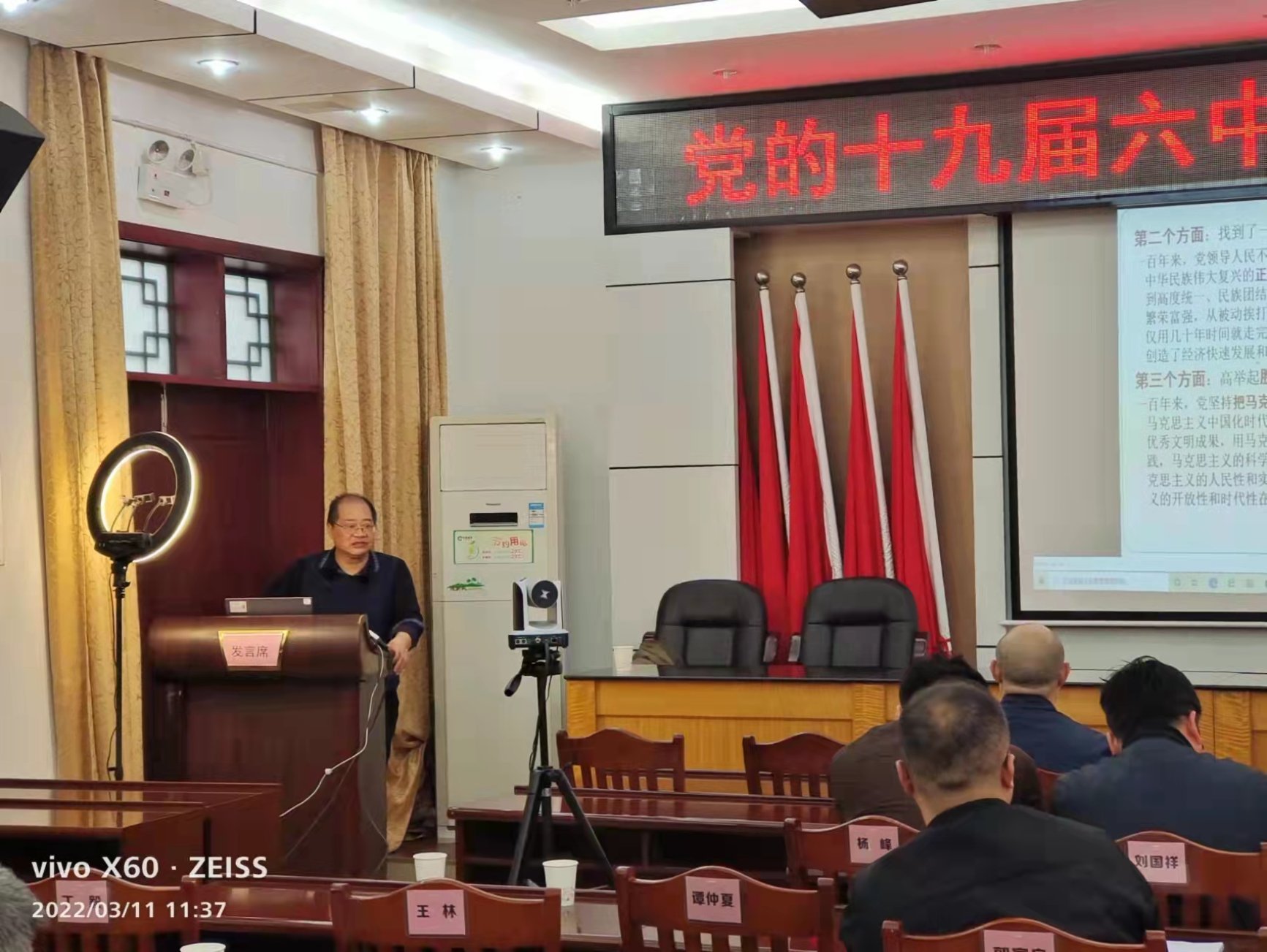 3月11日上午,我院博士生导师罗建文教授应邀在湖南省醴陵市烟草专卖局给该局机关干部宣讲党的十九届六中全会精神。会议由醴陵市烟草专卖局纪检组组长姜锴同志主持,局党组书记、局长、经理李玮同志及全体局领导全程参加宣讲会;醴陵市烟草专卖局局机关干部60多人在现场的报告厅听取了罗教授的宣讲,同时采取网络同步直播的方式向全市烟草行业管理部门和经营商户进行在线直播。据统计,有2158人参加了在线宣讲会。