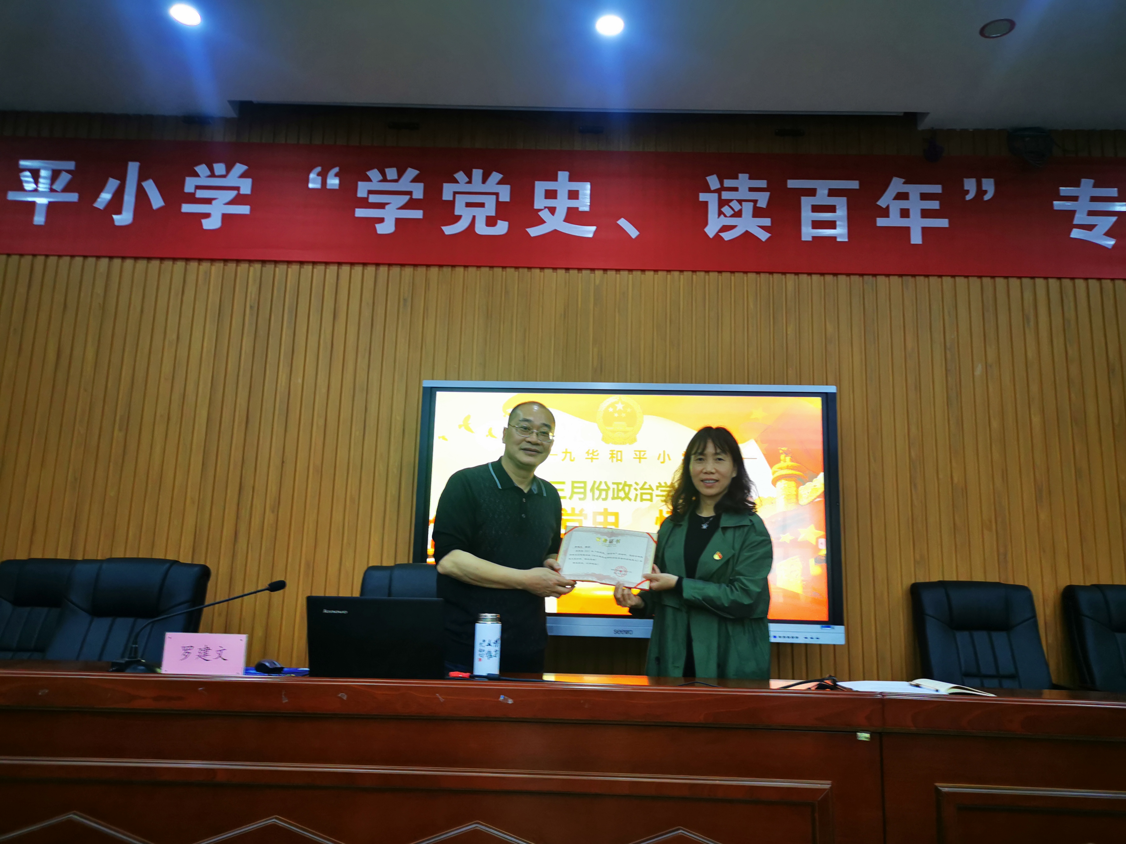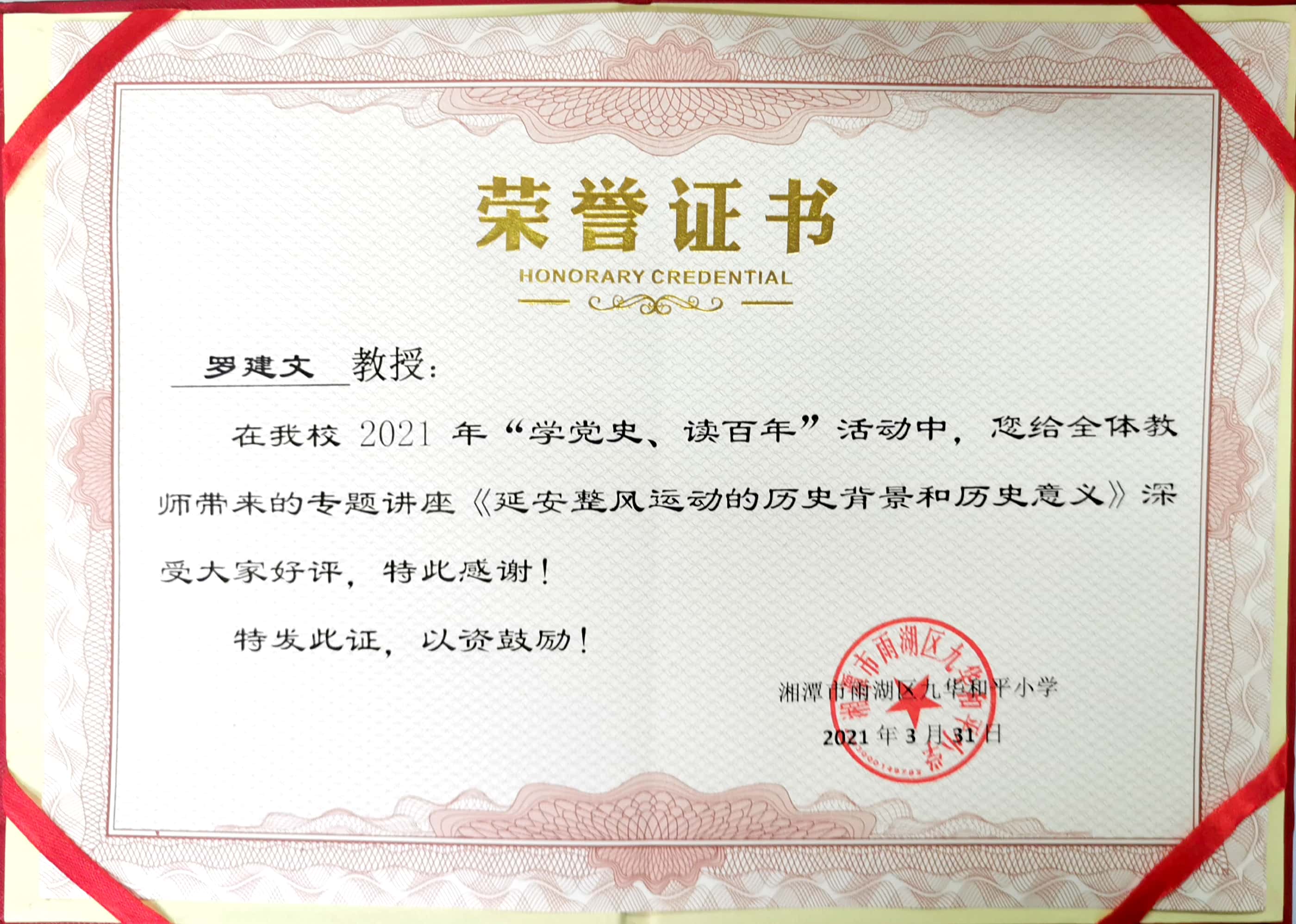 湘潭市九华和平学校校长丁素平在总结这次报告会时,给罗建文教授颁发了他们学校的致谢荣誉证书,并充分肯定了罗建文教授的报告;她认为报告不仅立意深远、史料丰富,而且引经据典、重点突出、结合当下,是一场生动深刻又富有教育意义的党史学习辅导报告,对于年轻教师来说是十分有意义的,她表示,学校今后将要结合党史教育主题活动,多开展这样的专家级的宣教报告会。