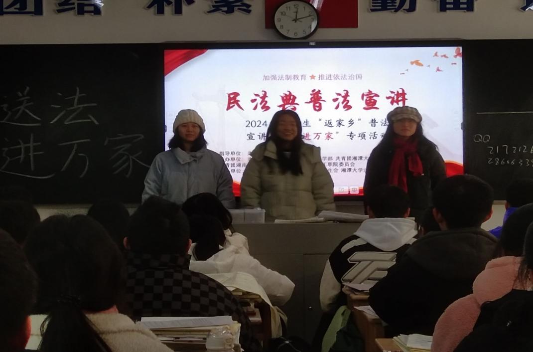 谌颖同学先后前往湘潭市档案馆和湘潭市红旗社区分别向档案馆工作人员和社区青年们讲述《民法》和《刑法》。她在讲述过程中不仅搭配生动有趣的动画视频,还通过开展知识竞答的有趣方式力求让法治的种子真正实现在万家生根发芽;方洁琼同学与普法小组成员来到桂东一中进行《民法典》知识点讲解,并走街串巷分发普法宣传册,让法治理念、法治思想走进更多居民心中;王亦男等同学积极参与“利剑护蕾·雷霆行动”等送法下乡活动,普及《未成年人保护法》,着力提高未成年人自我保护意识与防范意识,以实际行动筑牢未成年人保护防线。