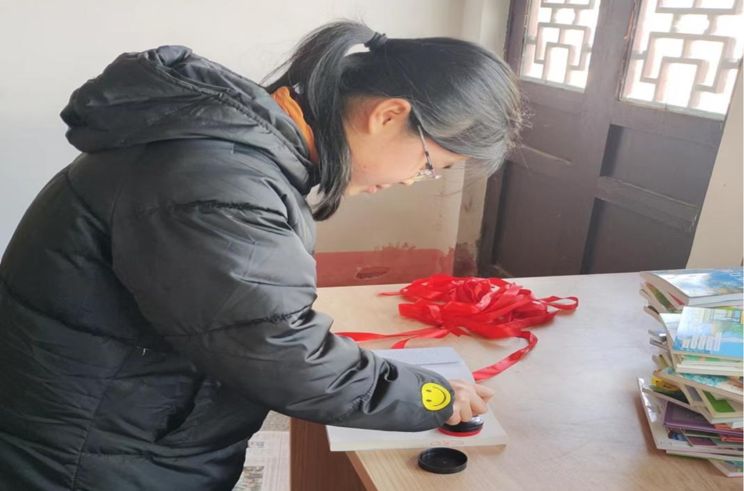 ▲刘念同学在永兴县图书馆给新书盖章