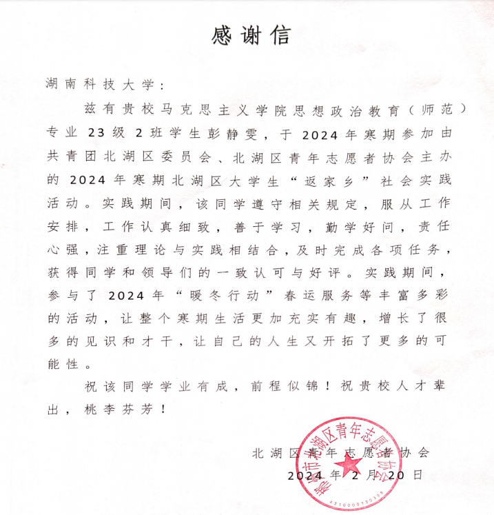 ▲郴州市北湖区青年志愿者协会对彭静雯同学的感谢信