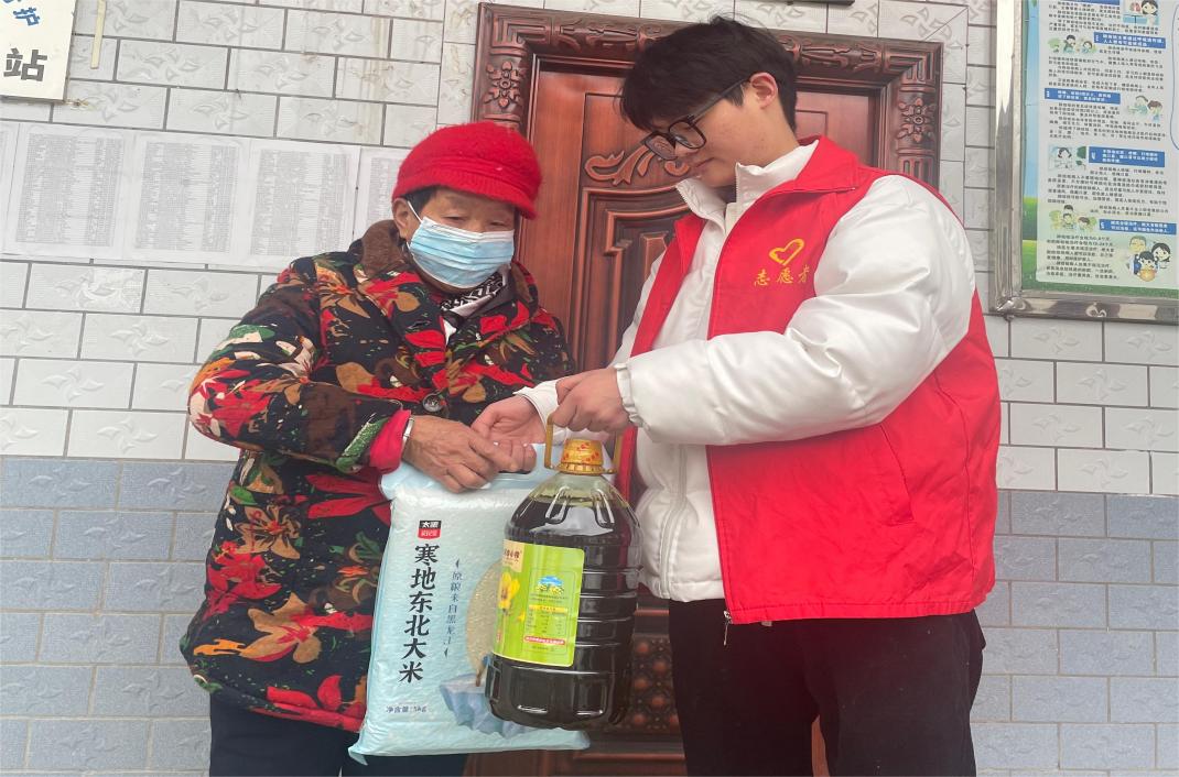 ▲曹刚川同学为社区老人发放慰问品