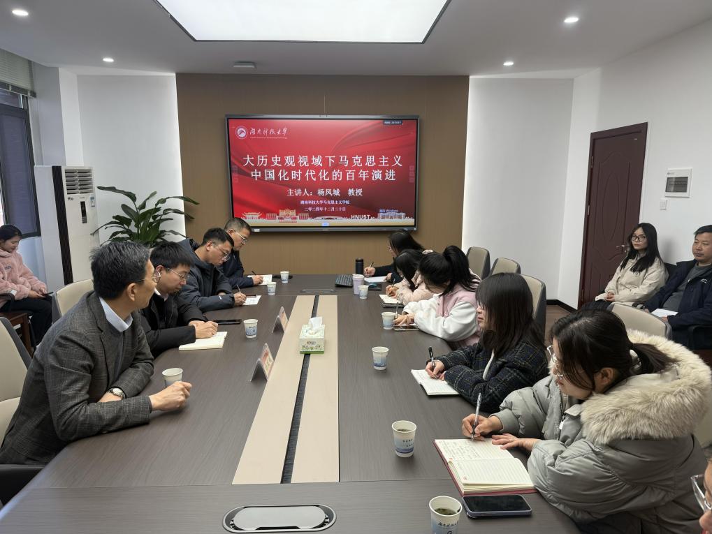 12月20日下午,教育部“长江学者”特聘教授、中国人民大学中共党史党建研究院执行院长杨凤城教授应邀在立言楼A529为我院师生作题为“大历史观视域下马克思主义中国化时代化的百年演进”的专题讲座。讲座由学院党委书记刘正妙教授主持。