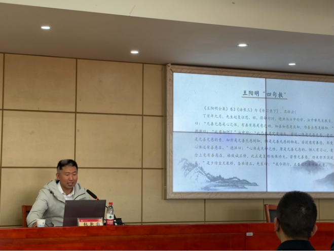 张新国教授结合《王阳明全集》《王畿集》等经典文献,精准解读了“无善无恶心之体,有善有恶意之动,知善知恶是良知,为善去恶是格物”的核心内涵;从阳明心学的理论体系出发,剖析其哲学要义,并结合思政育人工作,探讨传统哲学智慧在当代人才培养中的应用路径。讲座最后,张新国教授与在场研究生展开互动交流,耐心解答了同学们关于阳明心学与思政研究结合的相关问题。
