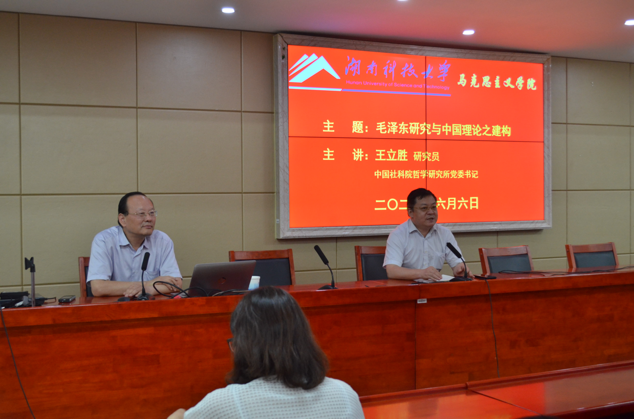 为推动学院党史学习教育高质量发展,特邀中国社科院哲学所党委书记王立胜研究员于2021年6月6日上午到学院作党史学习教育学术报告。报告会在立言楼学术报告厅5-1举行,报告的主题是“毛泽东研究与中国理论之建构”。报告由院长吴怀友教授主持,学院部分教师和研究生到场聆听。