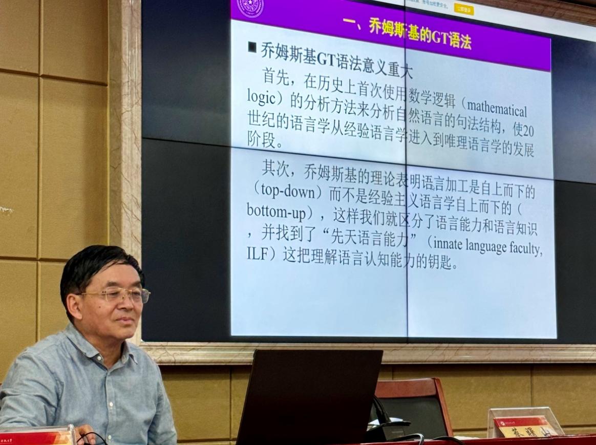 蔡曙山教授从“乔姆斯基的GT语法”“认知科学与人工智能”“从GT到人工智能:人工智能到底走了多远”“人工智能不能做什么”四个方面展开讲述。蔡教授以2024年诺贝尔物理学奖授予人工智能领域专家作为开篇,引出人类已经进入认知科学新时代。除了已经确定的认知科学学科结构之外,由于教育学与心智高度相关,因此教育学也被纳入到认知科学框架之中。他认为,当前教育应当更加注重学生认知能力的培养,而不仅仅是传授和学习知识。在蔡教授提出的人类认知五层级理论中,低阶认知决定着高阶认知,高阶认知反过来影响低阶认知。随后他指出:乔姆斯基的GT语法表明语言加工是自上而下的,从最基础的句法结构可以衍生出所有类型的语句,语言能力遗传实验证明人类拥有“先天语言能力”;而ChatGPT作为人工智能发展链条中最新一环,正是根据乔姆斯基的GT语法演变而来的,只不过比GT多了一个“预训练”(Pre-trained)环节;即使人和非人类动物都能进行学习行为,但语言、思维和文化是人类特有的,人工智能作为模仿人类思维活动的机器,无法产生意识和自我意识。