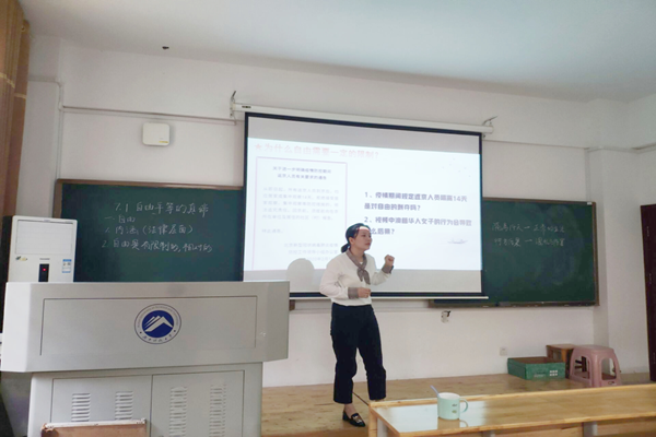 本次比赛在主持人激情的开场白中拉开序幕。参赛的选手按照抽签的顺序登台展示,在完成教育问答后,每位参赛者进行10分钟的片段教学展示。参赛者各显神通,熟练运用多媒体教学手段,一一展现扎实的师范技能。最为精彩的是片段教学展示,参赛者教学设计和课件制作的水平,以板书配合教学,选手或声情并茂,或严肃认真,使整个竞赛精彩纷呈。参赛选手谢丽莹以“自由是有限制的、相对的”片段教学,以热点事件视频引入自由概念的界定,剥茧抽丝剖析自由为何是有限制、相对的,课堂互动多样,表现力强,赢得了评委和听课师生的一致认可,最终在众多选手中脱颖而出。