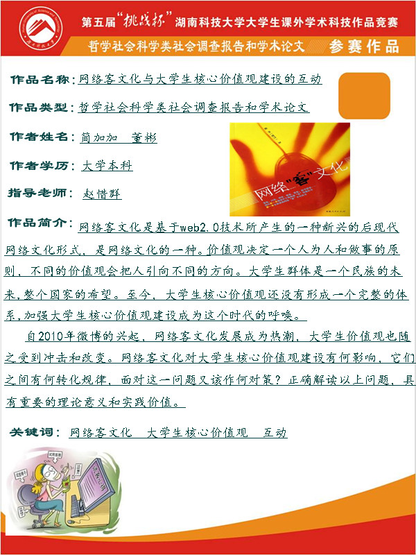 由于组织得力,宣传到位,我院学生对于此次竞赛积极参与。经过初赛,在众多的作品中,汤呵、朱会斌的《湖南省高校维吾尔族学生管理问题的调查与对策研究》与简加加、董彬的《网络客文化与大学生核心价值观建设的互动》脱颖而出。为补充完善两篇作品,学院还专门召集老师和往届获奖学生开展互评会以进一步研究论题。