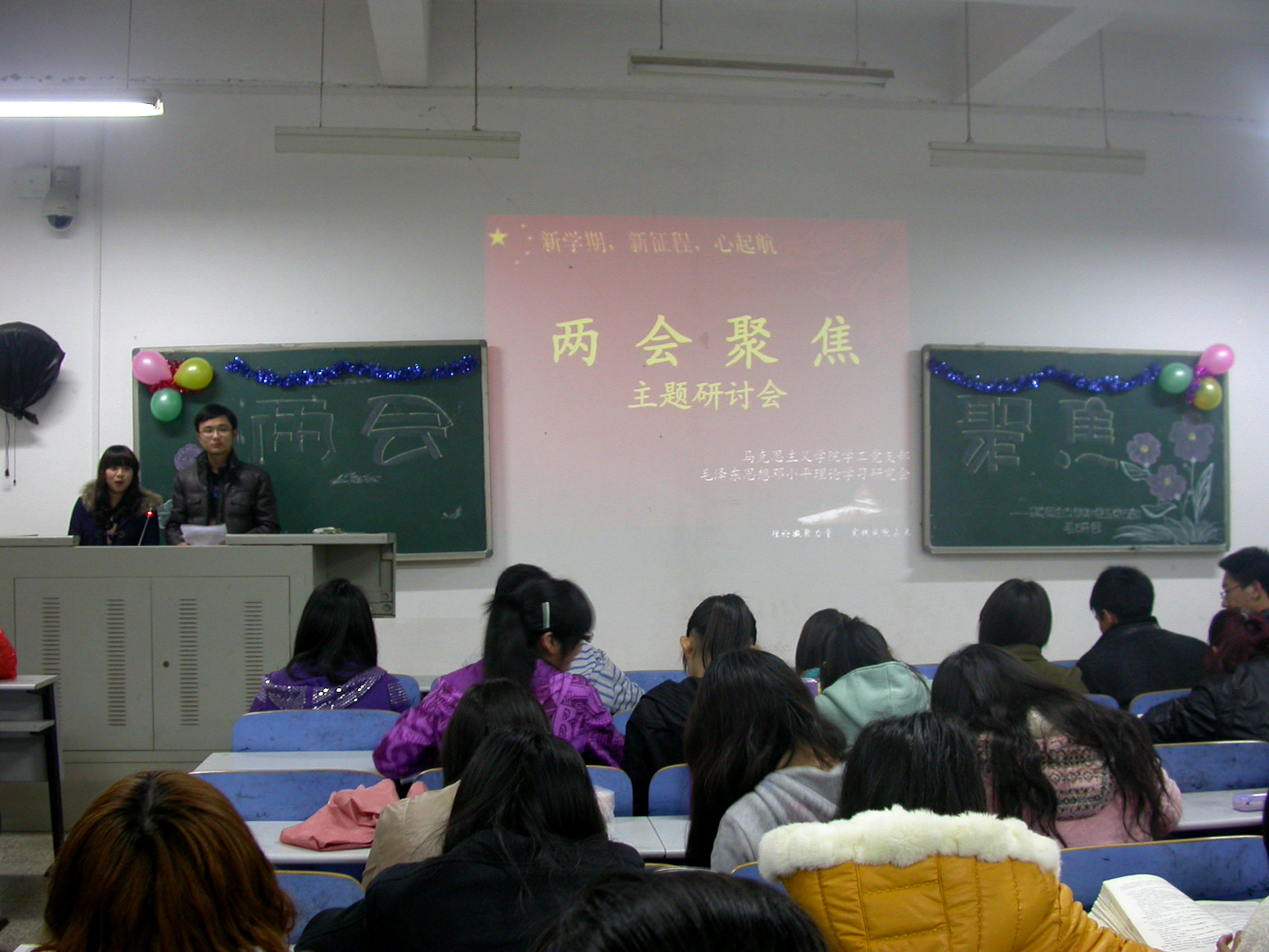 在十余日的会议讨论后,两会圆满落下帷幕。以各大媒体和新闻网报道两会的时政热点为话题,由永利yl23411学工党支部主办的毛研会研讨活动于2013年3月28日19时在第八教学楼1-1室举行,我院学生会副主席周秋云和办公室主任张丽新与会。