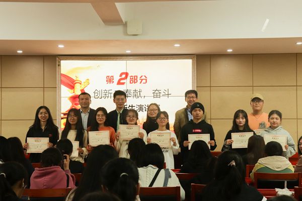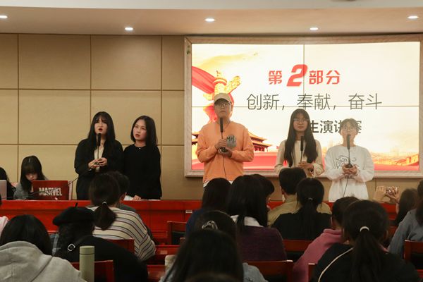 中场休息后进行的是以“创新、奉献、奋斗”为主题的演讲赛,每个选手的演讲时长为三分钟。胡卫枫通过对乡村教师的介绍,号召大家应该让“青春之花”在祖国最需要的地方绽放,在祖国最需要的地方进行奉献和奋斗;胡欣妍通过对青春的赞颂,向同学们阐明了大学生应该好好把握在大学的宝贵时间的道理,渲染了一幅美丽的大学画卷;在欧芝林的演讲中,她强调敢于创新、乐于奉献、奋斗不止才是一个大学生该有的精神面貌。