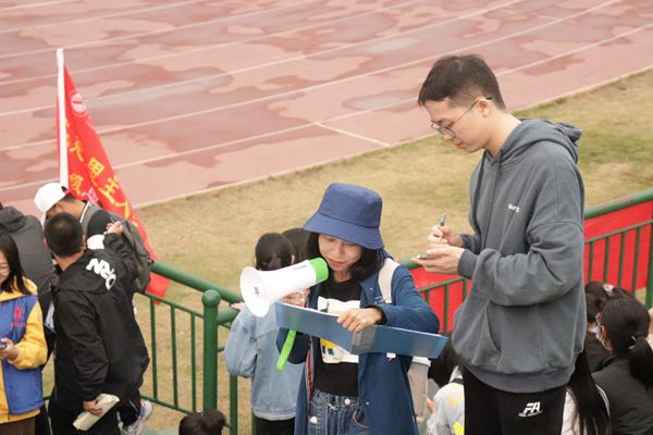 在观众席上,有这么一群人:他们在嘈杂的人群中举着喇叭询问每一个人的到场情况,他们严格记录下每个离场人员的离场时间及缘由。作为负责学生考勤监督的部门,他们严格记录、秉公行事。正是因为他们的贡献,才进一步强化了马院学子们的自律意识和时间观念。副部长刘德源对本届运动会观众的配合和表现表示欣慰:“大家都很团结热情,高度配合我们的工作,整体表现良好。”