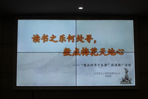为了提高学生的文化素养,开拓学生的视野,10月23日晚7点,由马院团委学生会网宣部组织的以“读书之乐何处寻,数品梅花天地心”为主题的“精品好书十本推”阅读推广活动于立言楼A5-1举行。我院学生会主席王子萱、网宣部全体成员及19、20级部分同学参与本次活动。