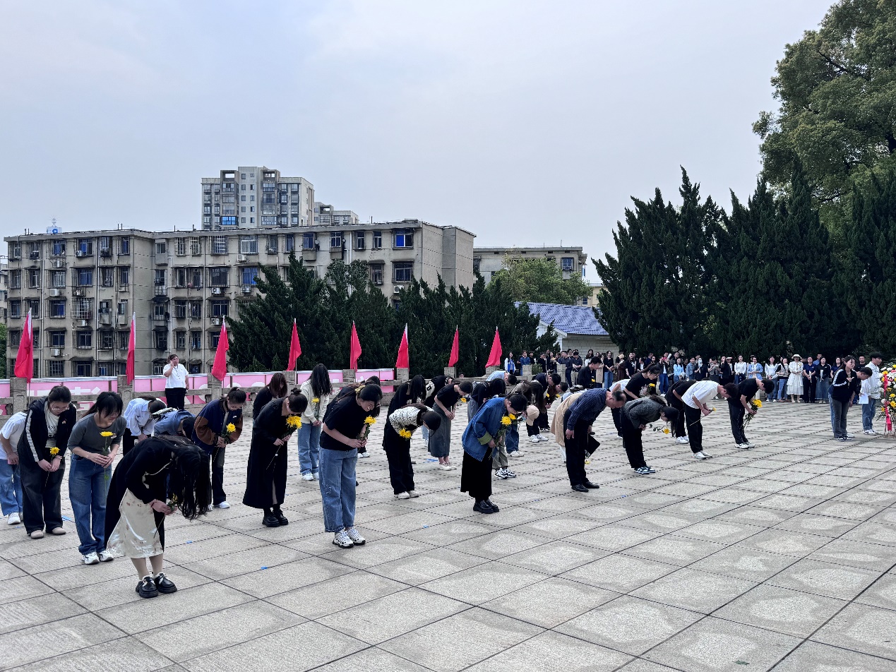 随后,学生代表刘磊、唐钰航缓步上前,向革命先烈敬献花篮,寄托哀思,深切缅怀革命先烈的丰功伟绩。最后,参加仪式人员手持菊花,绕烈士纪念碑一周,瞻仰烈士。
