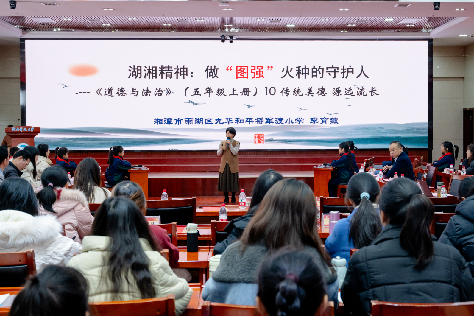 在小学学段,湘潭市雨湖区九华和平将军渡小学李育薇、湘潭市雨湖区九华和平小学杨越和湘潭大学附属实验学校周婷三位老师围绕教材知识点“《道德与法治》(五年级上册)10 传统美德 源远流长”进行教学展示。李育薇老师以“湖湘精神:做‘图强’火种的守护人”为题,从齐白石的事迹导入教学内容,引出“吃得苦、耐得烦、霸得蛮”的湖湘“图强”精神。杨越老师以“湖湘精神与“君有约”为题,由湘潭市响水乡黄君珏的个人故事引入教学内容,从湖湘英雄毛泽东、彭德怀、曾国藩、左宗棠等人的事迹中概括出“吃得苦、耐得烦、霸得蛮”的自强不息气节,并引导学生从身边、从自身故事中感悟何为湖湘精神。周婷老师以“‘吃得苦,霸得蛮’的湖湘人”为题,以彭德怀将军的事迹导入教学,引导学生概括彭德怀将军的崇高精神和介绍自己所熟悉的湖湘英雄人物,并引导学生思考在学习和生活中如何传承“心忧天下”的湖湘精神、传承“心忧天下”的湖湘精神,传承红色基因,厚植爱国情怀。湘潭市教科院教研员王飞从教师素养高、教学素材选取鲜活、教学活动重视综合性和实践性三方面肯定了三位老师的教学展示,同时也提出两点改进建议,即案例可以进一步具化、细化和教学内容进一步链接生活。