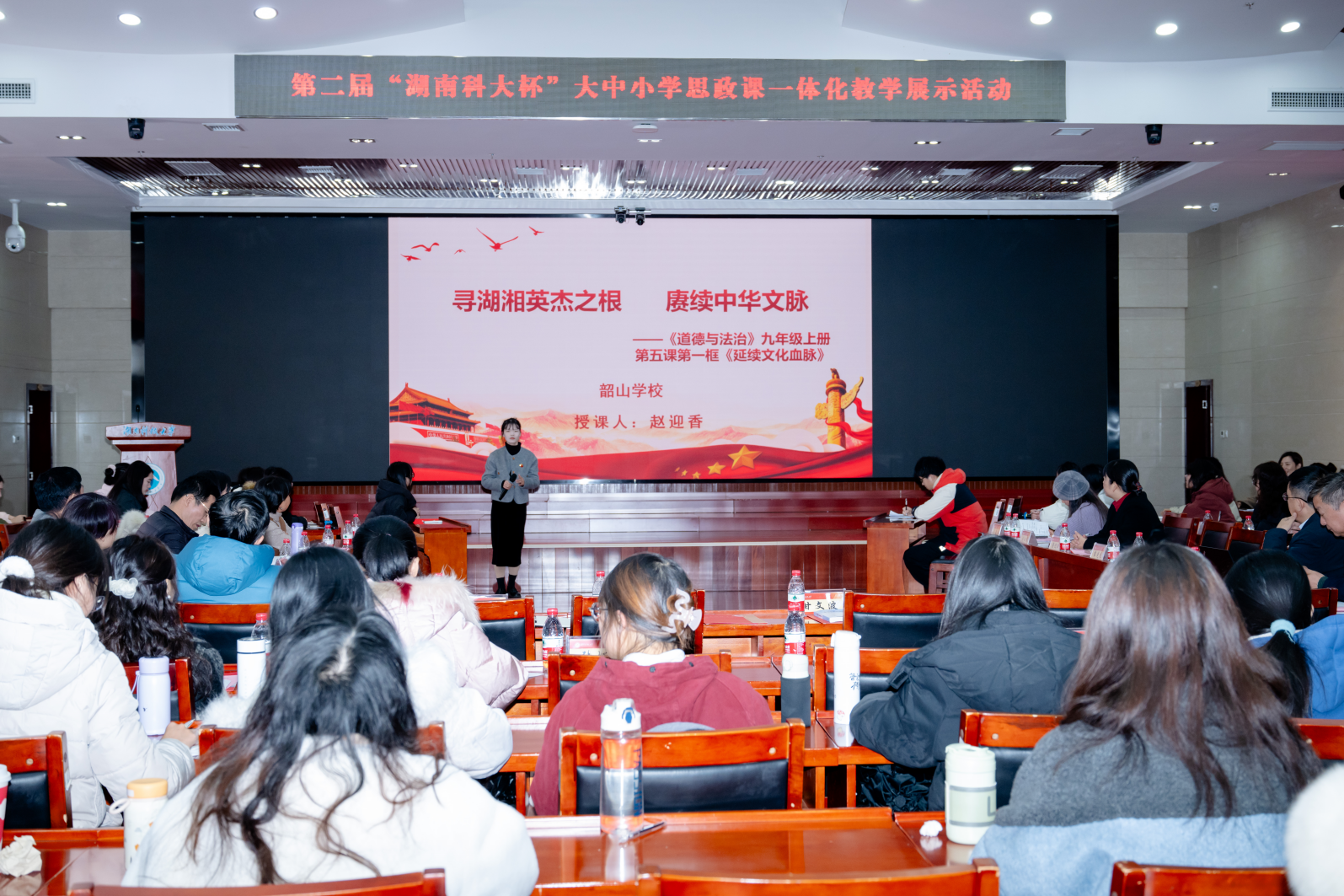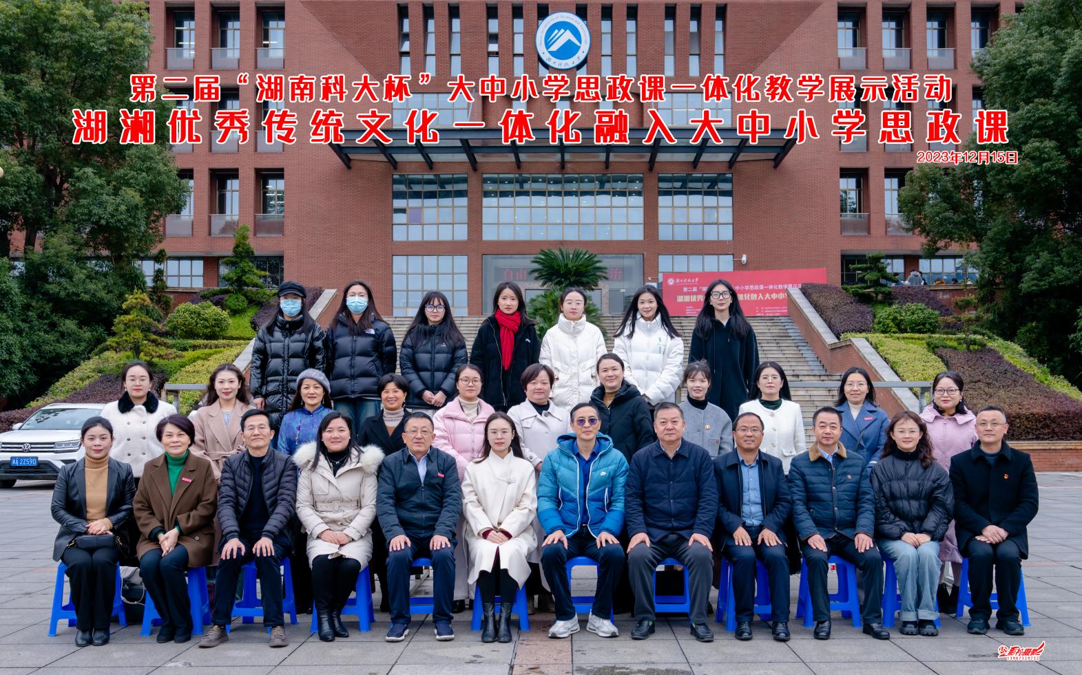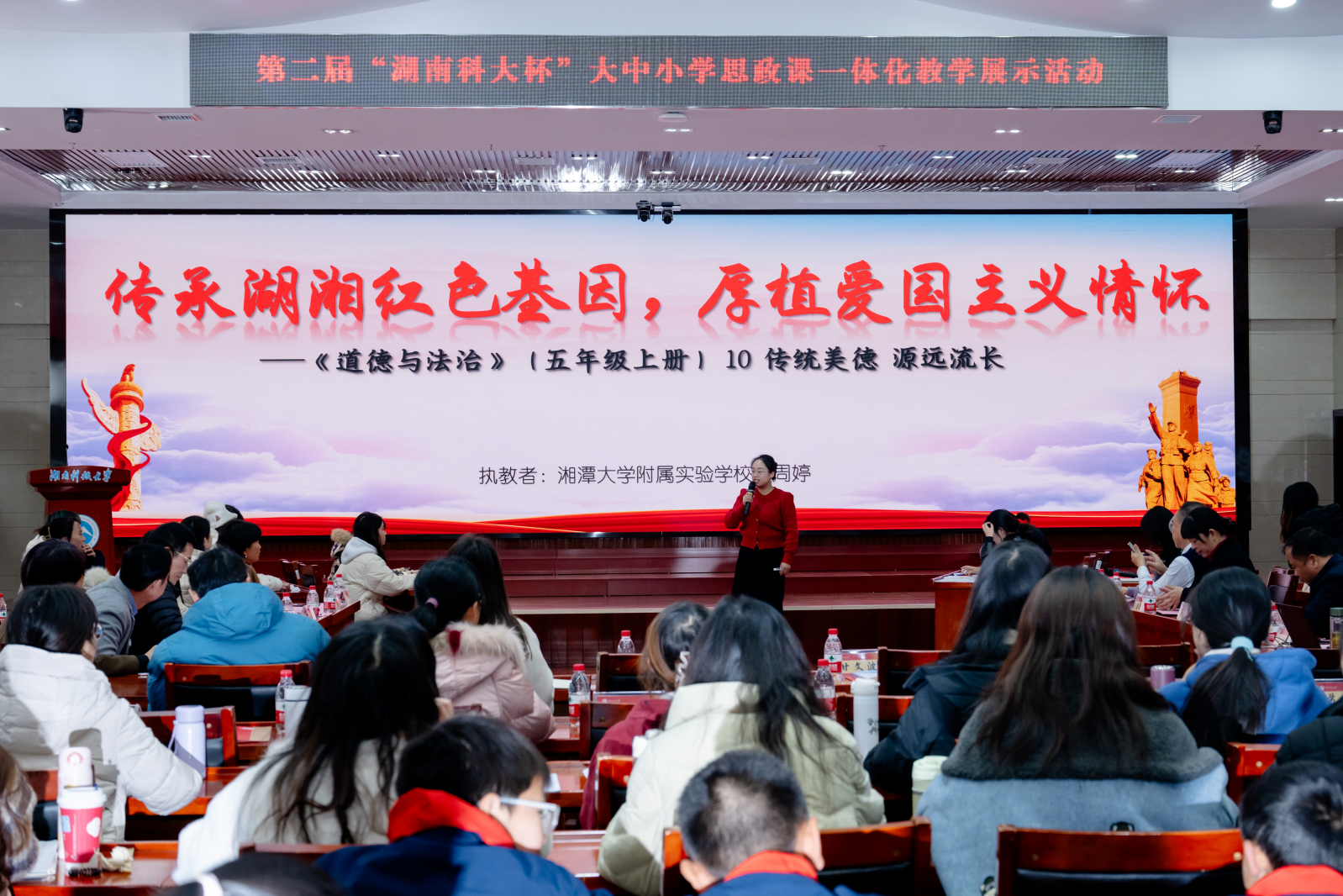 12月15日,我校与湘潭市教育局、全国高校思政课名师工作室(湖南科技大学)、湖南省高校思想政治工作名师工作室(禹旭才、刘正妙、吴毅君、颜柯)、湖南工程职业技术学院永利yl23411等单位,联合举办第二届“湖南科大杯”大中小学思政课一体化教学展示活动。此次活动以“湖湘优秀传统文化一体化融入大中小学思政课”为主题,于湖南科技大学立德楼五楼报告厅进行,并由“湖上青云”视频号同步直播。活动分四个环节进行。
