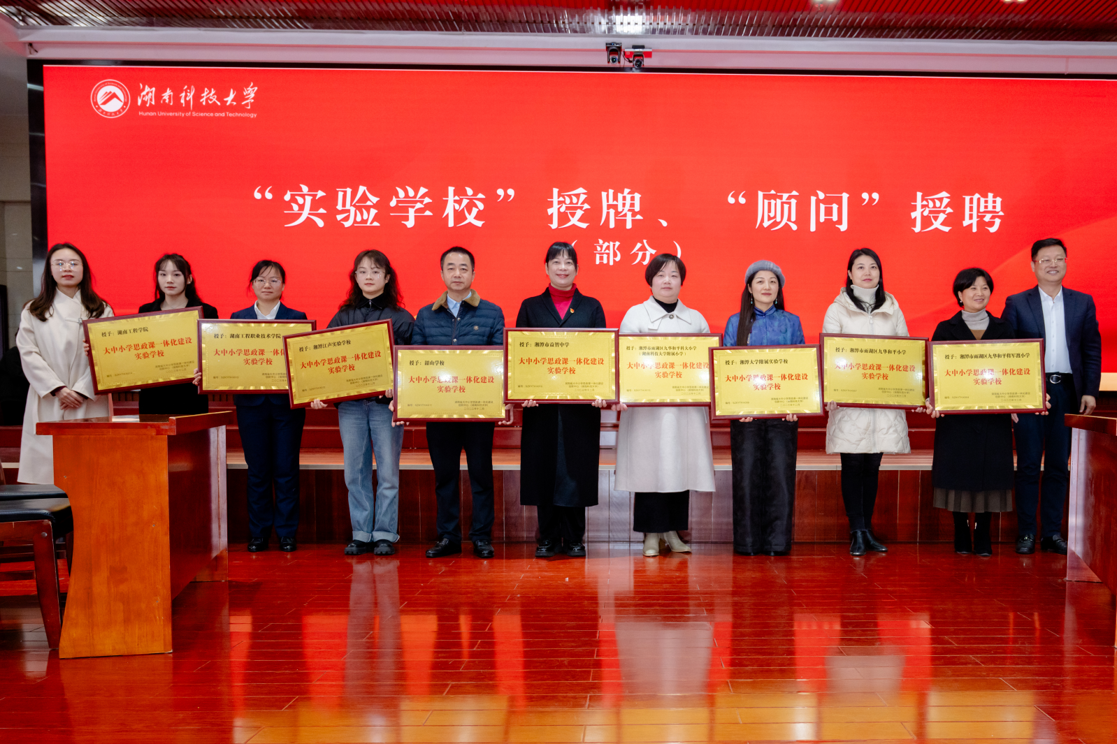 活动环节三为“大中小学思政课一体化建设实验学校”授牌和“大中小学思政课一体化建设顾问”授聘。被授牌的学校共有九所,分别是:湘潭市雨湖区九华和平将军渡小学、湘潭市雨湖区九华和平小学、湘潭大学附属实验学校、湘潭市雨湖区九华和平科大小学(湖南科技大学附属小学)、湘潭市益智中学、韶山学校、湘潭江声实验学校、湖南工程职业技术学院和湖南工程学院。未来,“实验学校”将在大中小学思政课一体化建设中起到先行、示范的重要作用。受聘的顾问共有四位,分别是全国高校思政课名师工作室(湖南科技大学)负责人吴怀友、湘潭大学永利yl23411副院长杨小军、湘潭县教研室教研员陈武进、湘潭市教科院教研员王飞。顾问均为有深厚专业功底和较大影响力的专家、教授,顾问授聘将有助于集思广益、博采众长,更好地推进大中小学思政课一体化建设工作。