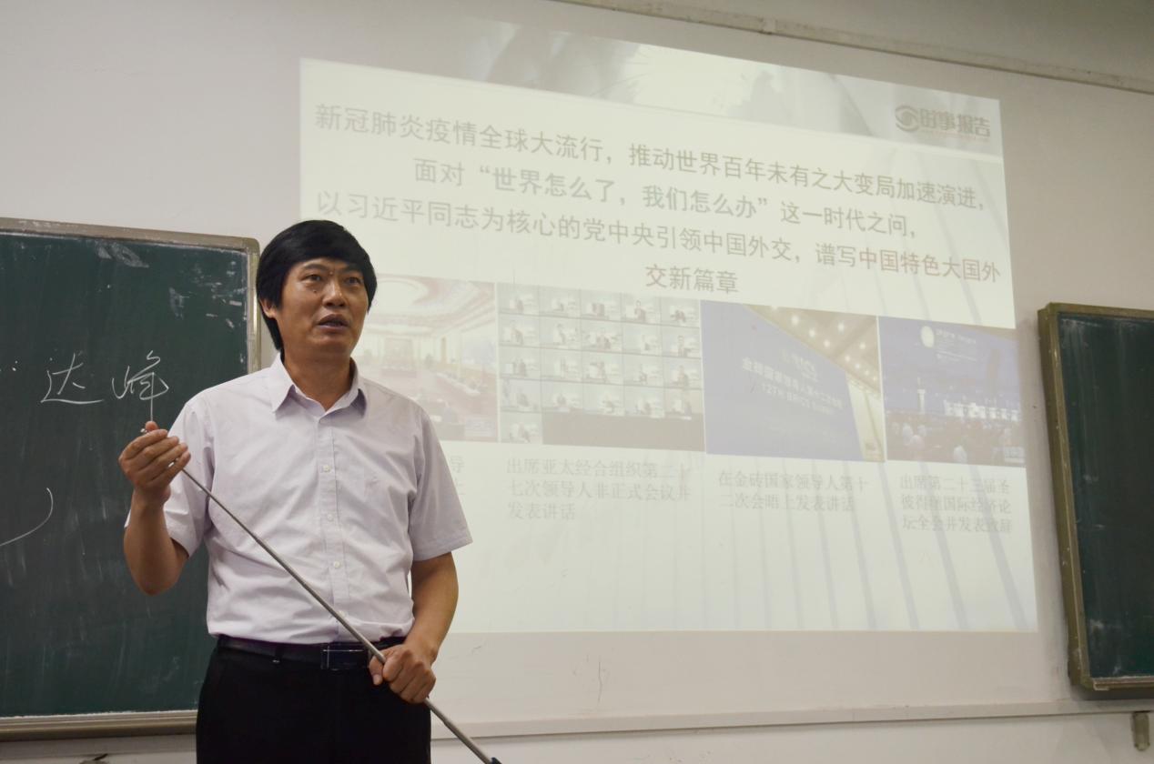 6月30日下午七八节课,副校长赵前程在一教102教室为我校商学院的本科生上了一堂以“中国特色大国外交”为主题的“形势与政策”主题思政课。铃声响起,在同学们整齐的“老师好”声中,赵前程开始了精彩的讲课。