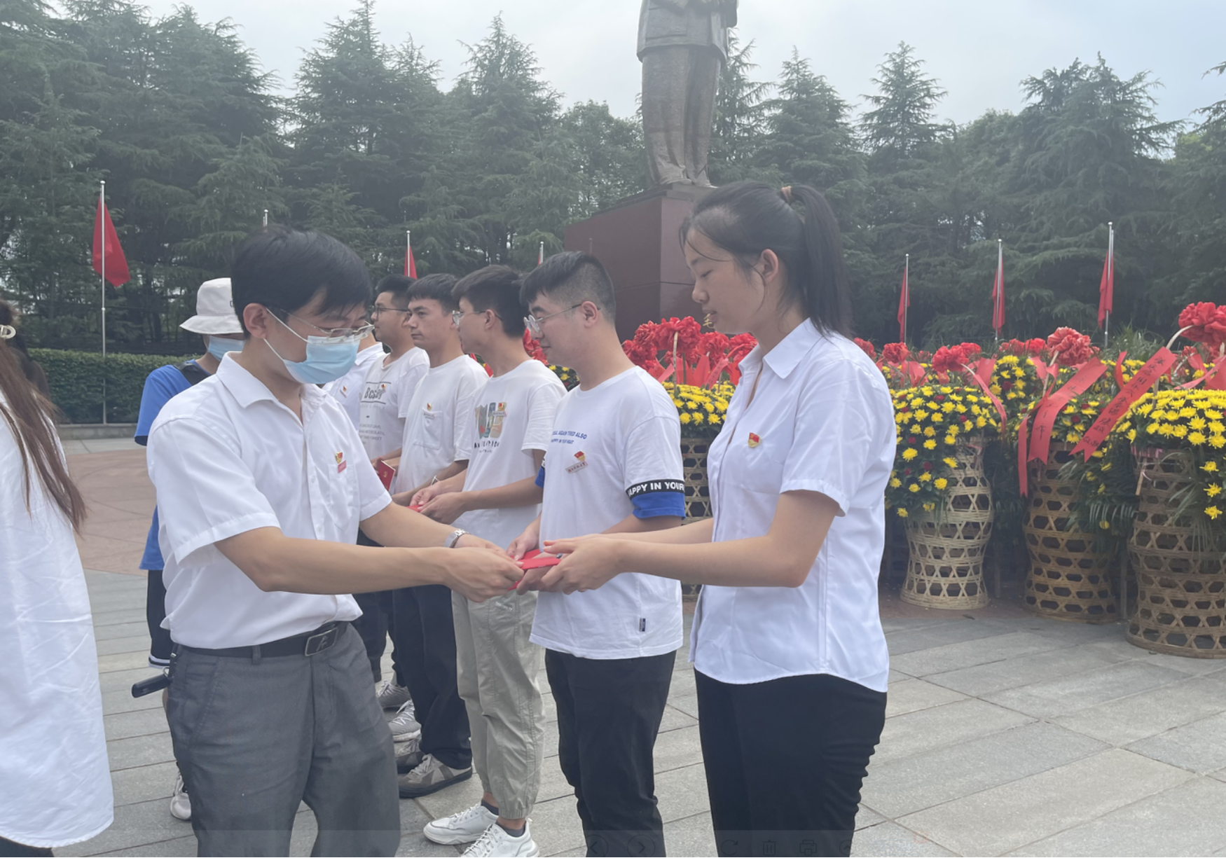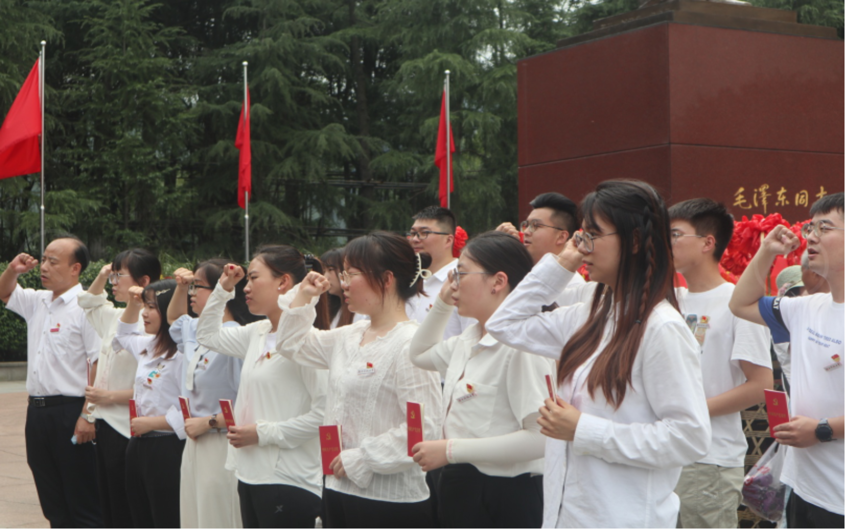 活动第一项内容,在毛泽东铜像广场由院党委书记刘正妙向新发展党员颁发《中国共产党章程》,并合影留恋。然后由党委副书记刘图其同志领誓,新发展党员郑重地举起右手,面对鲜红的中国共产党党旗举行入党集体宣誓,各位党员同志慷慨激昂,以铿锵有力的声音表达身为一名中共党员的自豪感和使命感,增强了严守党章党规的规矩意识和全心全意为人民服务的宗旨意识,进一步坚定了新发展党员的理想信念。