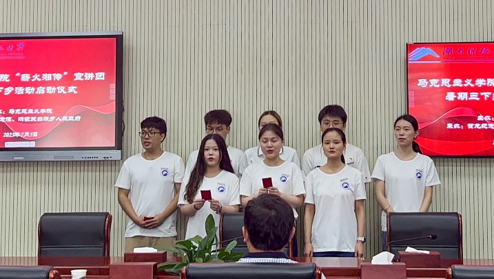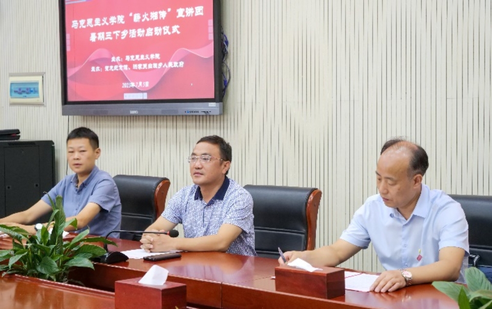 启动仪式伊始,洪家关白族乡乡长王星明介绍了贺龙元帅故居桑植的相关情况,分享了桑植红色文化资源的开发建设情况,希望我院“薪火湘传”理论宣讲团“三下乡”社会实践能够进一步开发好、宣传好元帅故里的红色文化。