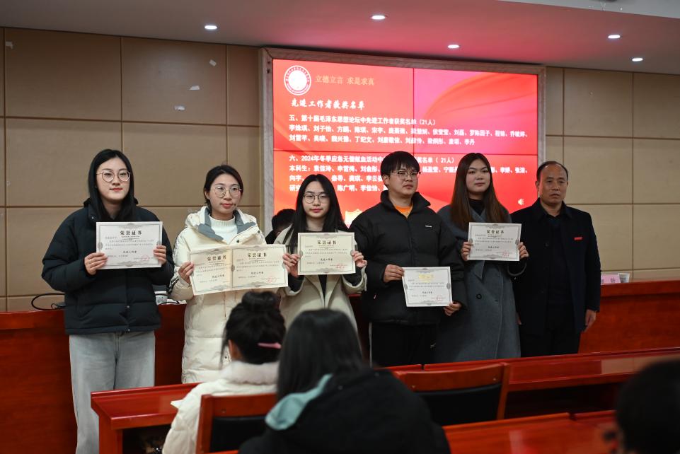随后,会议进入表彰环节。阳继樱宣读了2023年度个人校级以上获奖名单,邹昕宣读了2023年度先进工作者名单,由刘图其、刘哲、阳继樱、罗娜为获奖代表颁奖并合影留念。