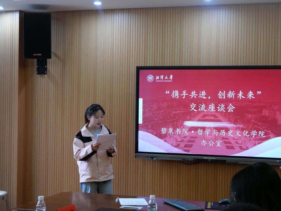 为增强校际间协同联动,共同探索提升学生工作水平的有效途径,3月27日下午,我院研究生会成员赴湘潭大学与湘潭大学碧泉书院·哲学与历史文化学院研究生会共同开展主题为“携手共进,创新未来”的交流座谈会活动。