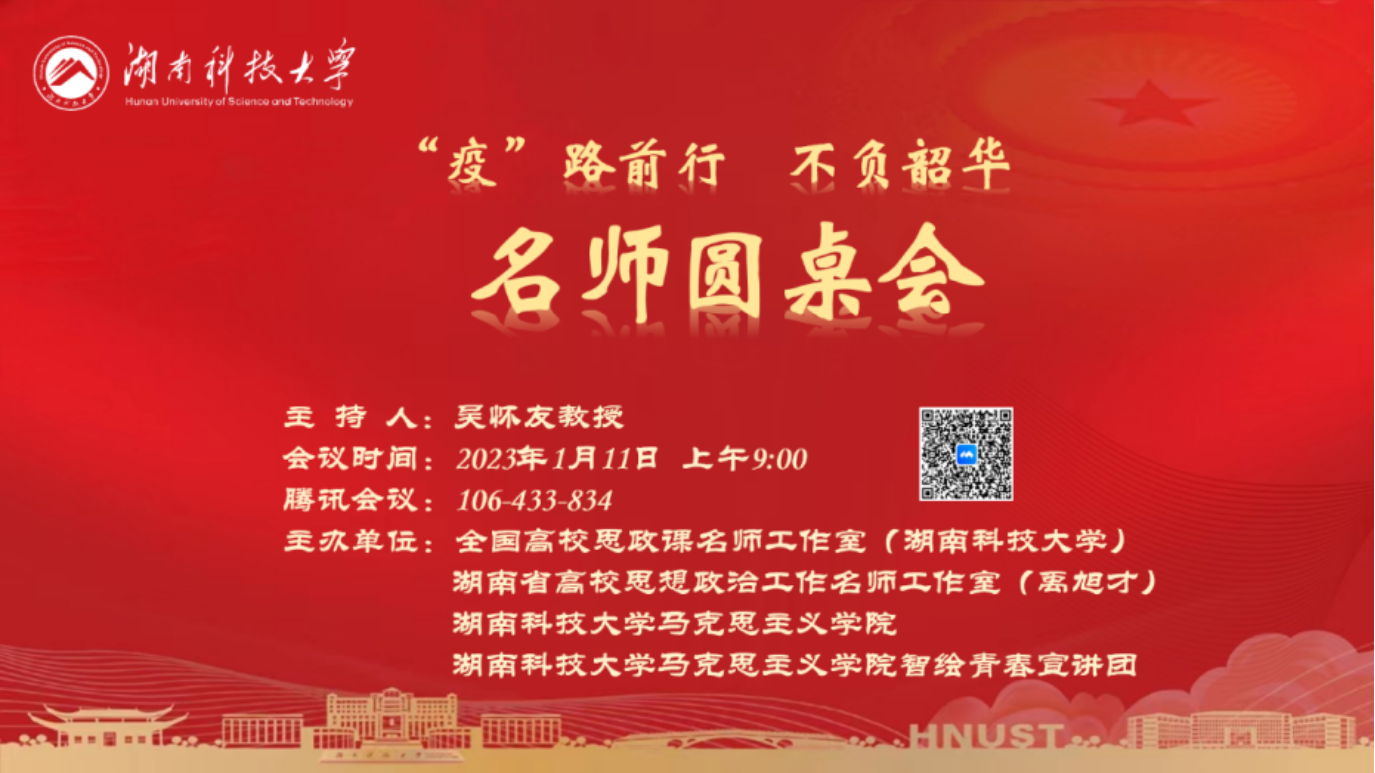 为进一步推动思政课教师下沉学生,形成老师关心学生、关爱学生、回应学生困惑的良好氛围,以提升思政课教学的针对性和实效性,1月11日上午,全国高校思政课名师工作室(湖南科技大学)、湖南省高校思想政治工作名师工作室(禹旭才)、永利yl23411及智绘青春宣讲团通过腾讯会议平台联合举办了以“‘疫’路前行、不负韶华”为主题的名师圆桌会。本次圆桌会由全国高校思政课名师工作室(湖南科技大学)负责人吴怀友教授主持,名师工作室核心成员、永利yl23411和江西师范大学永利yl23411部分师生共70余人参加会议。