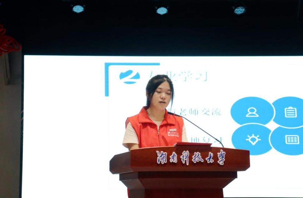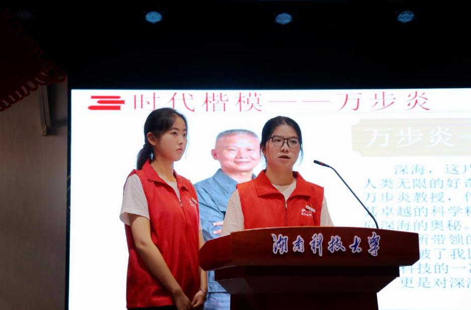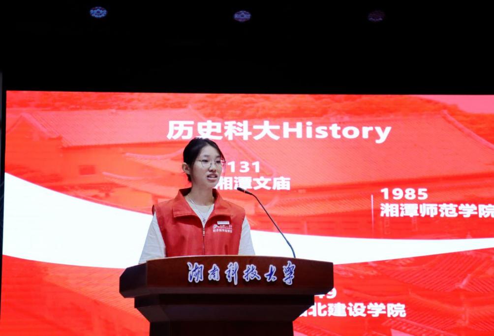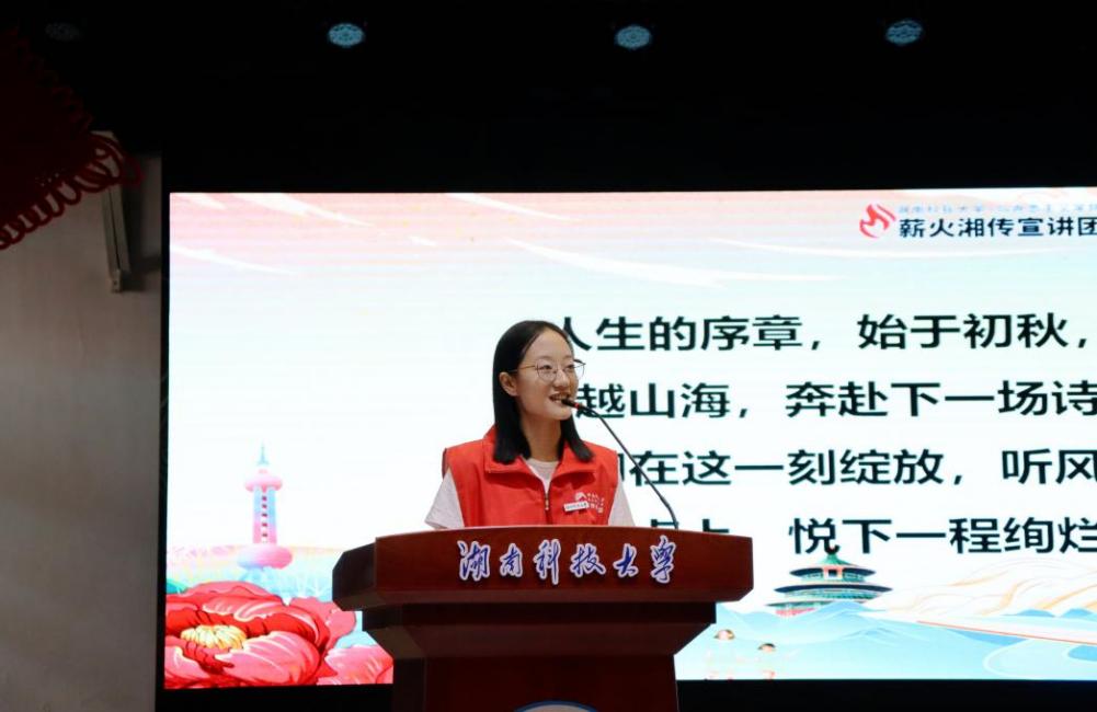 薪火“湘”传宣讲团同学从理想信念教育、校史校情教育、典型人物教育和榜样树立教育四个部分进行内容介绍。