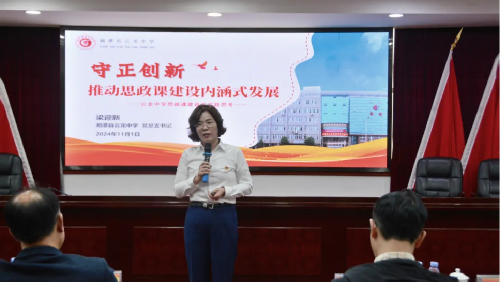 首先,由湘潭县云龙中学党总支书记梁迎新带来“守正创新,推动思政课建设内涵式发展”的主题汇报。梁书记系统分析了云龙中学在思政课建设中的创新成果和实践探索,提出构建“贯彻一个根本遵循”“完善一个领导体制”“贯穿一个核心内容”的“三个一”体系,强化党的领导,全面落实立德树人任务。她强调,学校要通过“建强综合型团队”,不断提升教师专业素养和团队协作能力,并重视师德师风建设,致力打造一支政治素质过硬、教学水平高超的思政教师队伍。