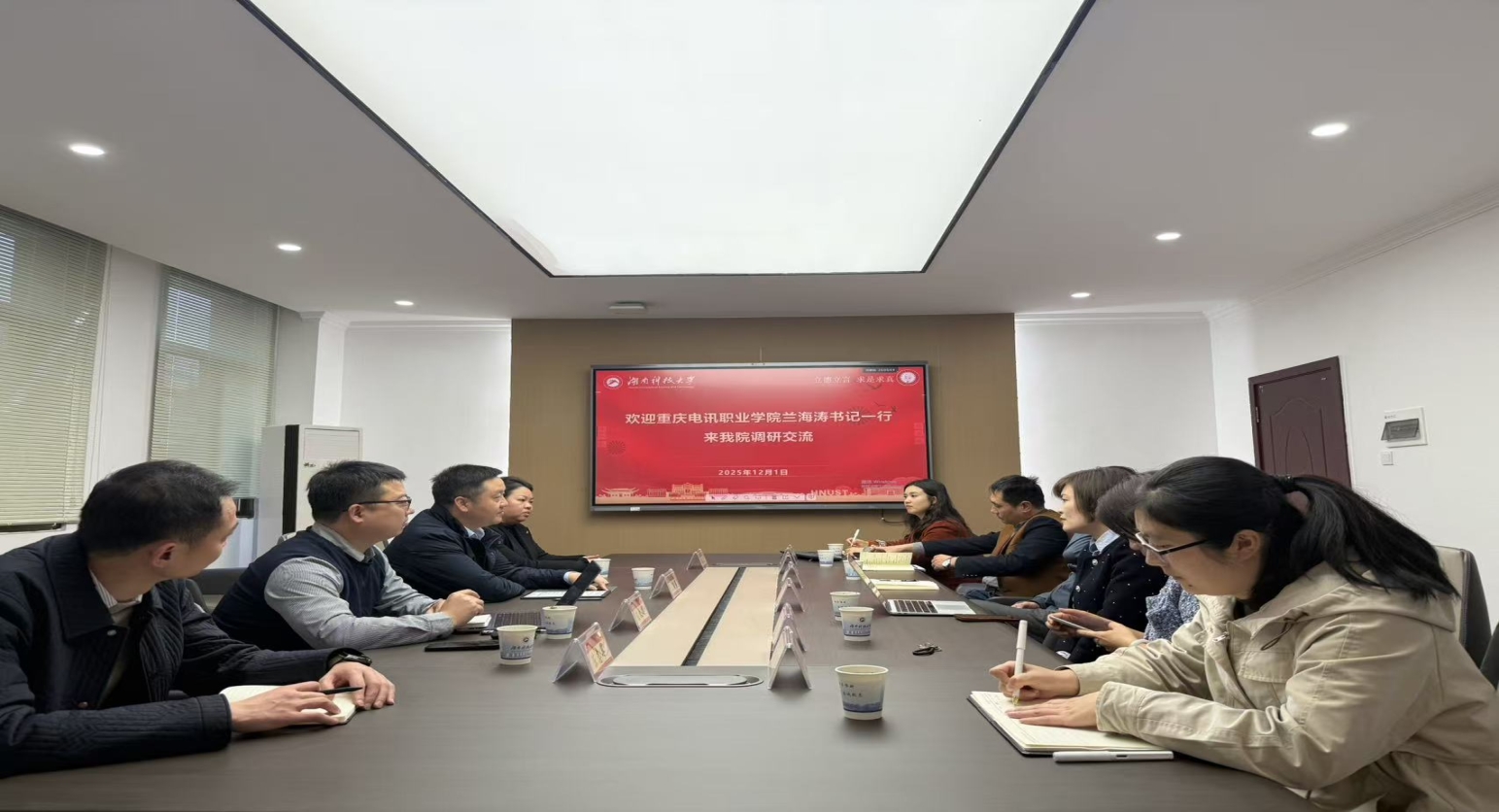 12月1日下午,重庆电讯职业学院党委书记兰海涛、党政办公室副主任陈志军、财务处副处长郭小兰、科研处副处长陈义辉一行四人来我院调研交流。院党委书记刘正妙、副院长薛光远及相关职能部门负责人梁长平、吴巧玉、毛纯参加了交流座谈会。