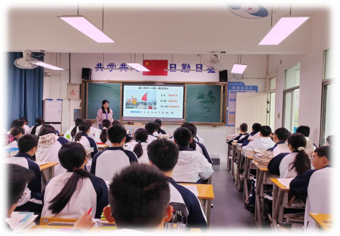 活动首站聚焦课堂实践。湘潭县二中胡依曼老师与湖南科大实习教师王承业、夏文轩同台授课,呈现多元教学风格。胡依曼老师以扎实的理论功底与鲜活的本土案例,串联起理论与现实的联结;两位实习教师则以青春视角设计互动环节,通过情境模拟、议题探讨、习题讲解激发学生思辨热情,初显青年教师的教学活力。课堂之外,科大马院与县二中教务处同步检查实习资料,对实习生严谨的备课笔记、细致的教学反思、实习队的精细化管理给予高度肯定。