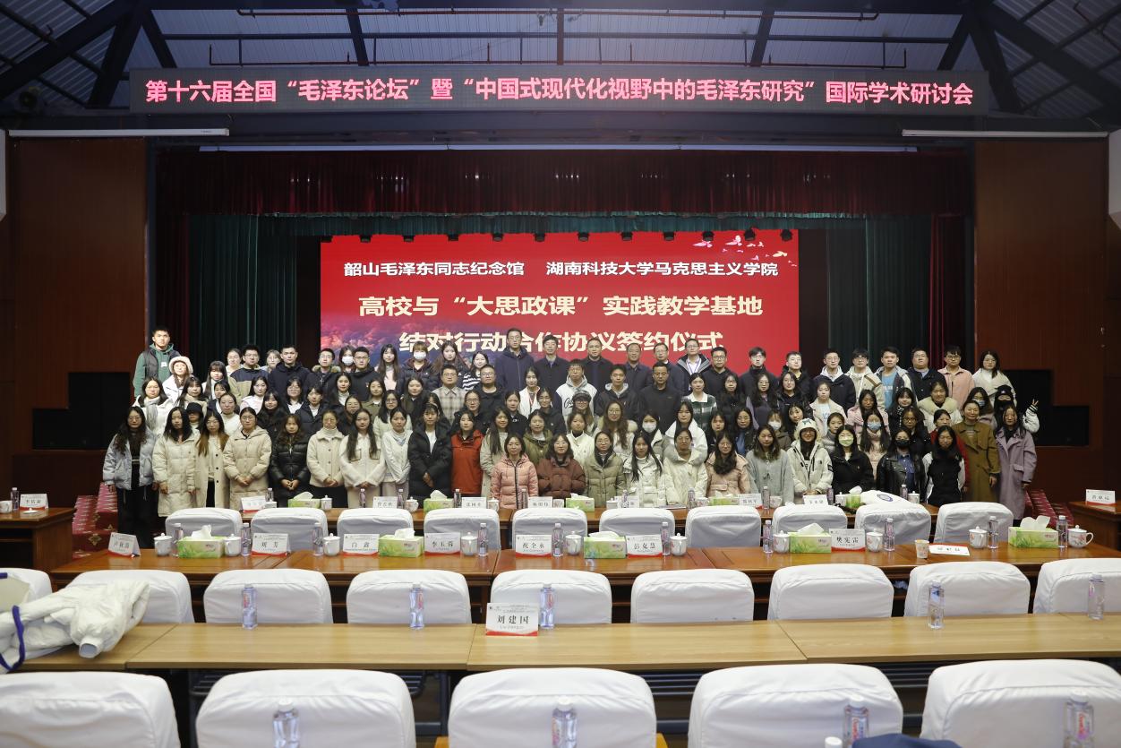 为深入学习贯彻习近平总书记在中央政治局第五次集体学习时的重要讲话精神,坚持不懈用习近平新时代中国特色社会主义思想铸魂育人,加快构建“大思政课”工作格局,充分发挥“大思政课”实践教学基地(以下简称基地)育人功能,不断提高思政课的针对性和吸引力,根据《教育部等十部门关于印发〈全面推进“大思政课”建设的工作方案〉的通知》(教社科〔2022〕3号)、《教育部办公厅等八部门关于公布“大思政课”实践教学基地名单的通知》(教社科厅函〔2022〕31号)、《教育部办公厅关于组织开展高校与“大思政课”实践教学基地结对行动的通知》(教社科厅函〔2023〕26号)等文件要求,12月3日,我院与韶山毛泽东同志纪念馆签订“高校与‘大思政课’实践教学基地结对行动”合作协议。我院许浩博士等教师作为学院代表参加了会议。