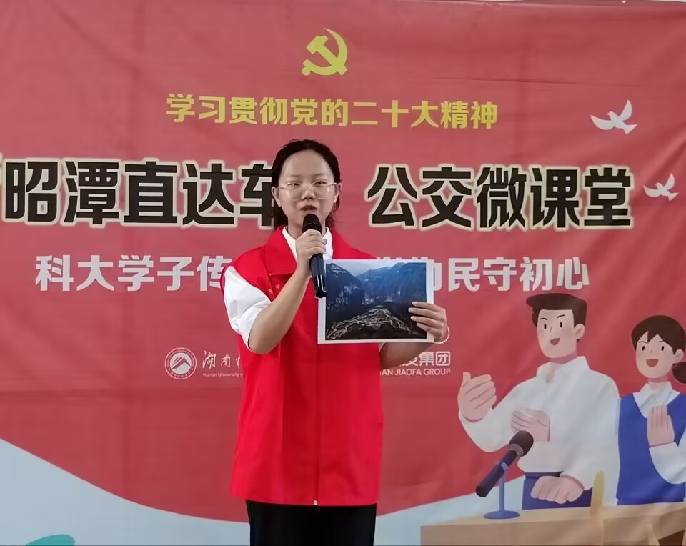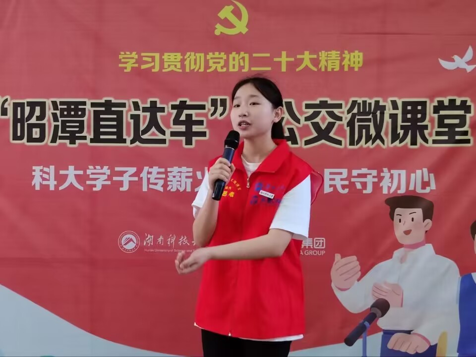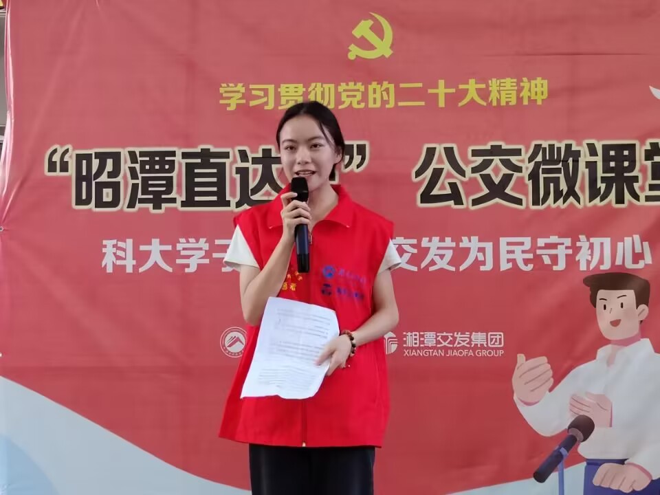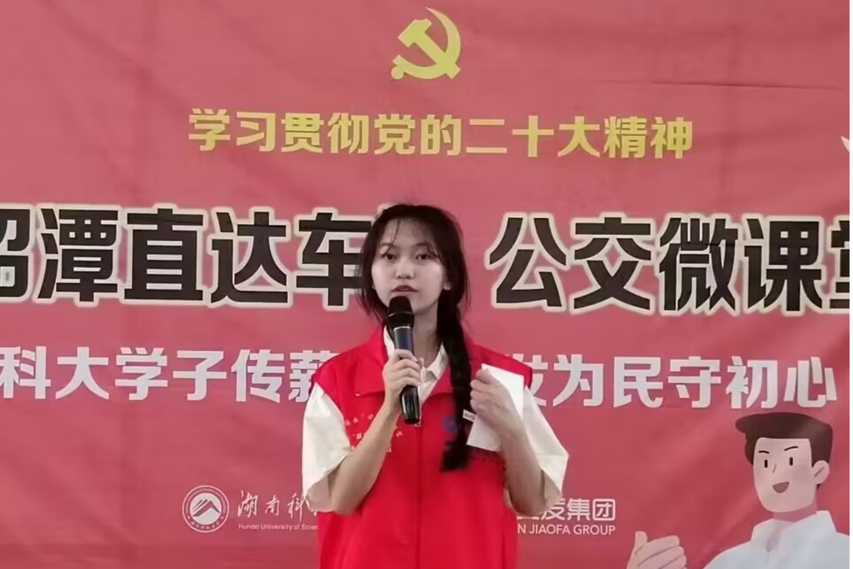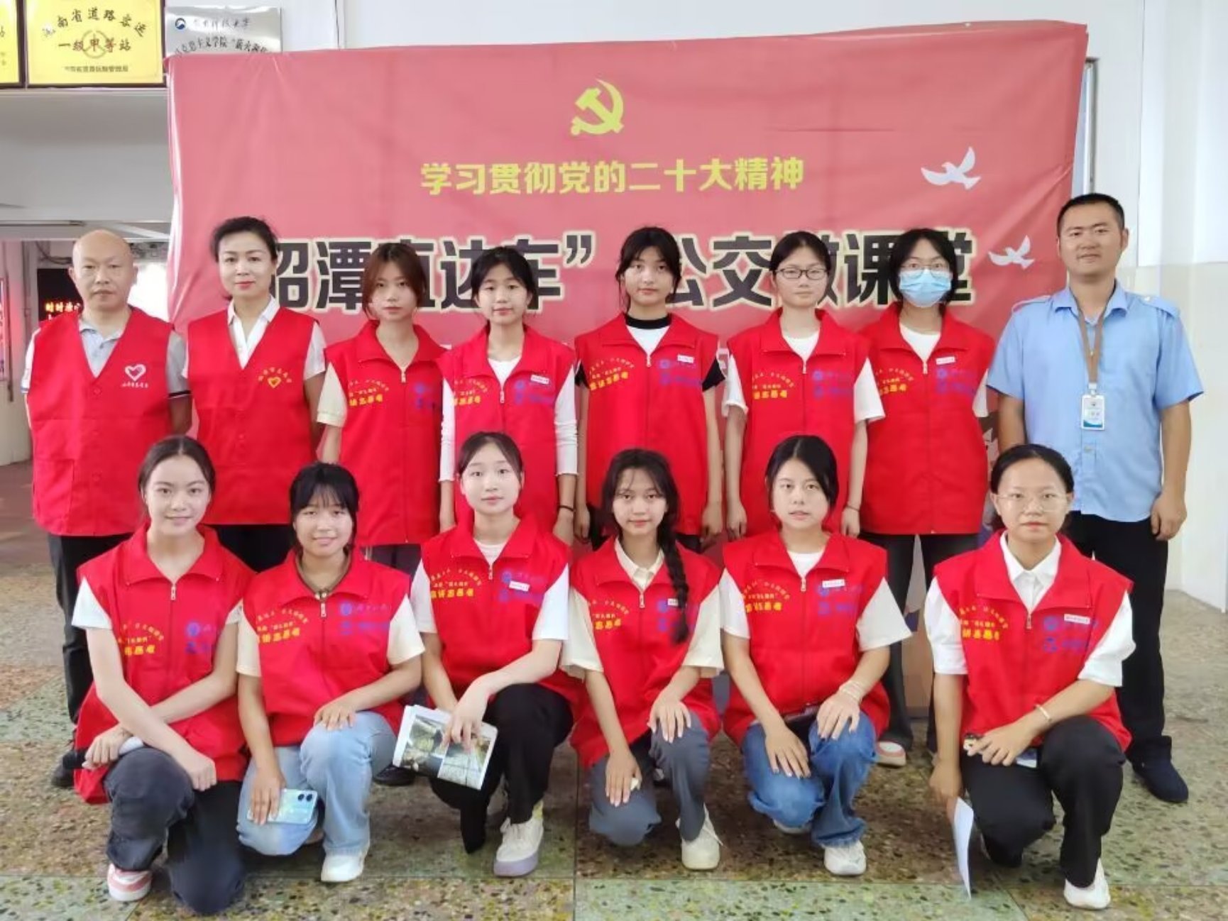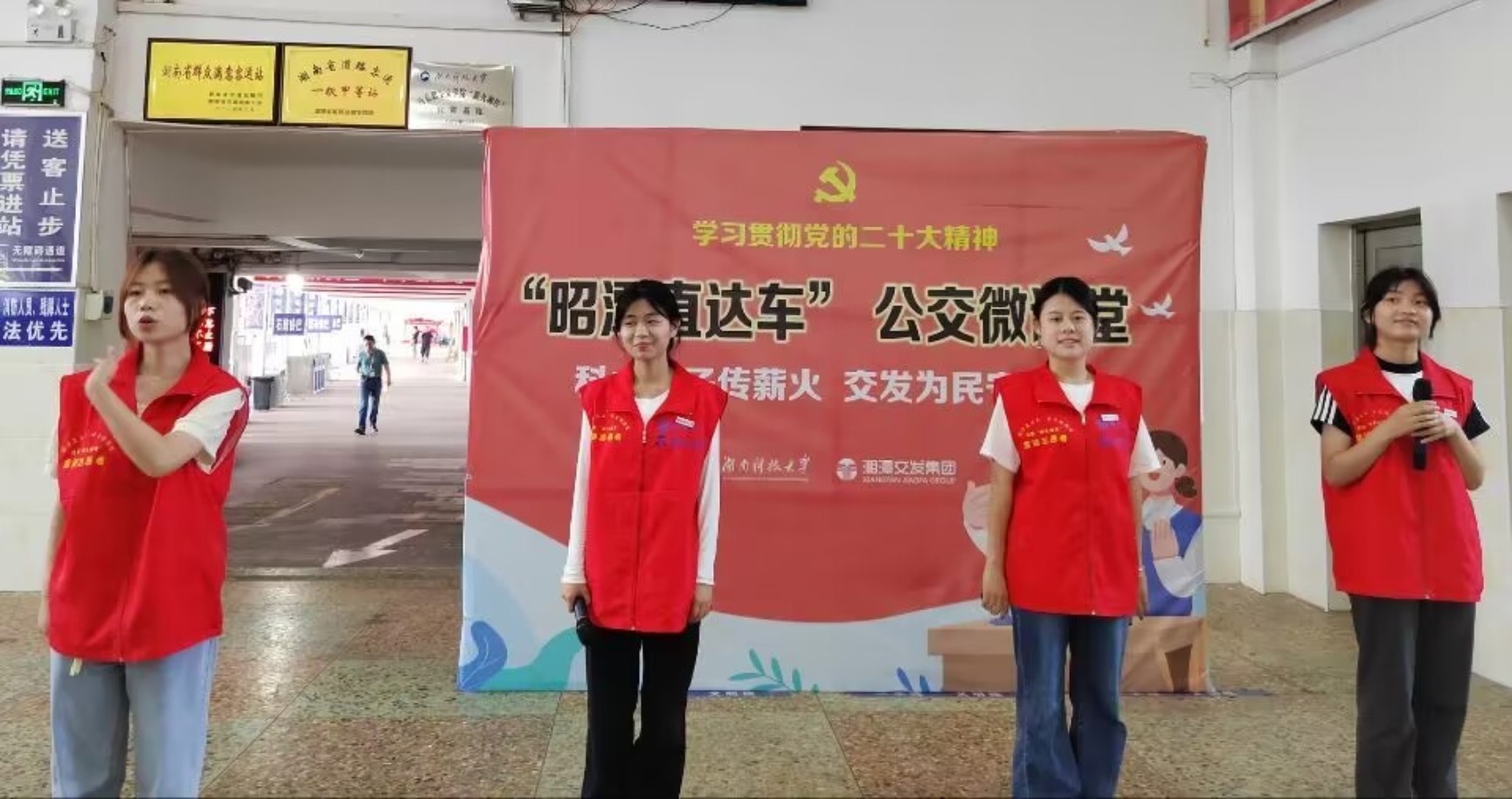 为了学习贯彻习近平新时代中国特色社会主义思想主题教育进一步走深走实。6月2日,院党委组织的“学习贯彻党的二十大精神”为主题的“昭潭直达车”公交微课堂活动在我院“薪火湘传”理论宣讲基地——湘潭汽车西站顺利开展。本次活动由我院“薪火湘传”宣讲团承担。