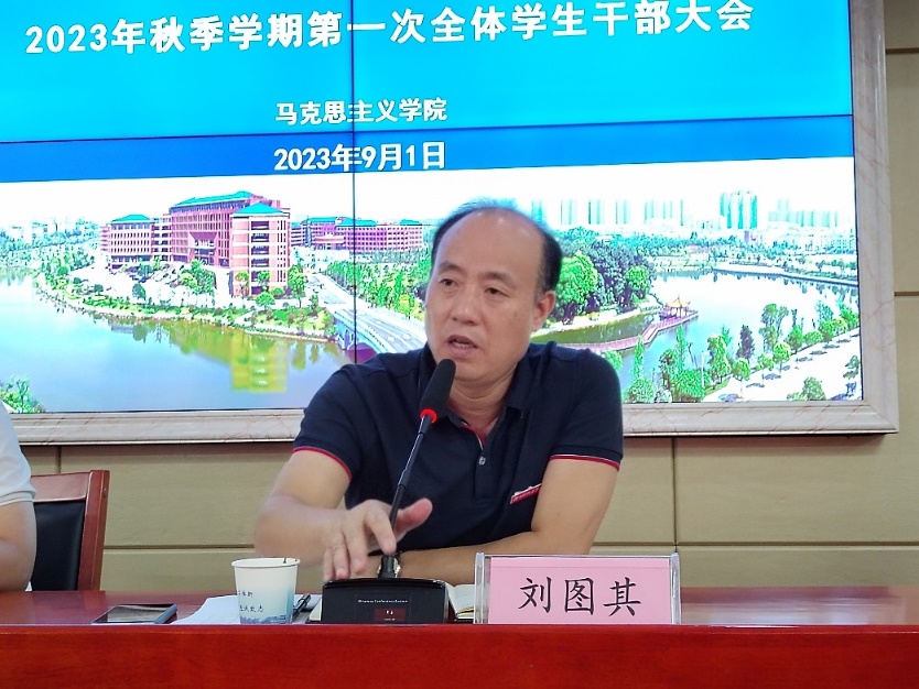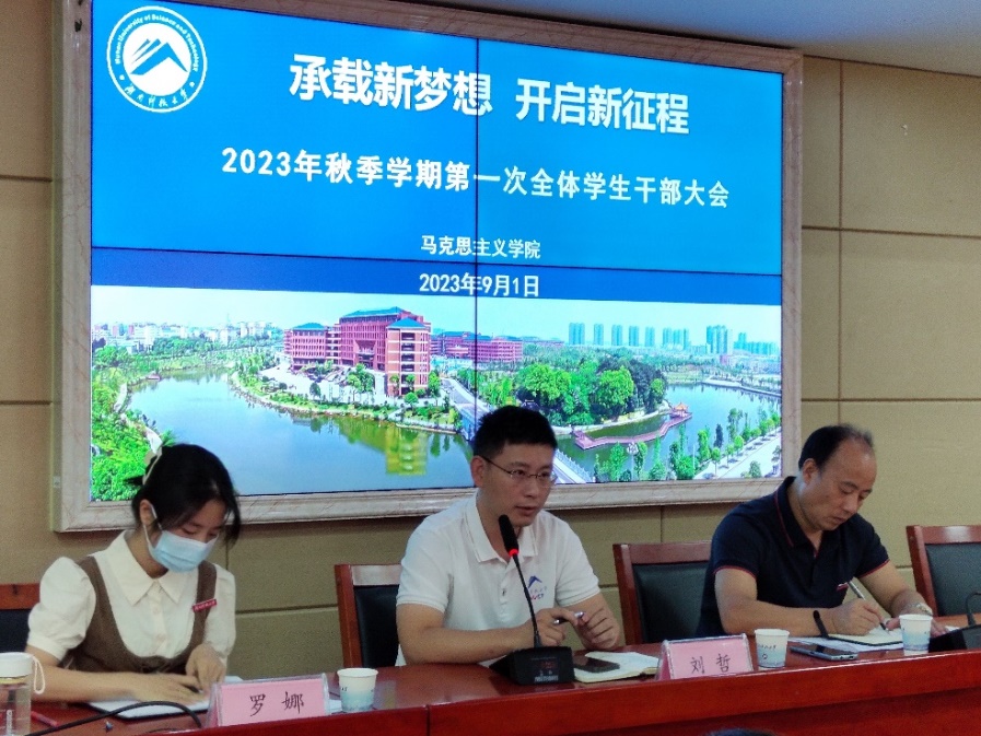 接着,刘哲对新学期学生工作做了要点提示:一是近期常规性的工作安排,责任到部门、到人;二是强调学生干部工作的纪律性;三是勉励全体学生干部应做好准备工作,以饱满的热情和充足的准备迎接新生入校。