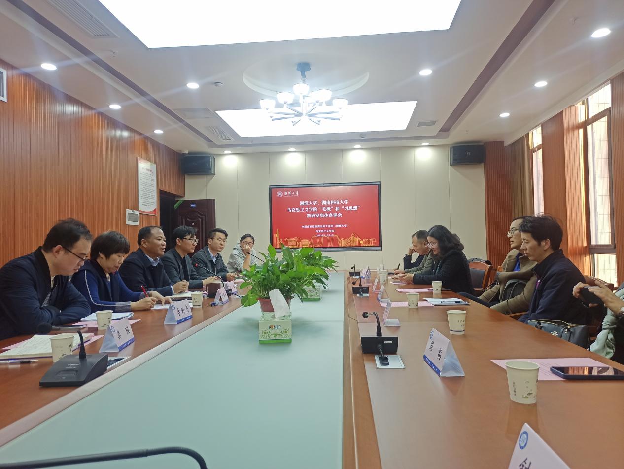 11月24日下午,湖南科技大学、湘潭大学永利yl23411“习近平新时代中国特色社会主义思想”联合教研室成立仪式在湘潭大学毛泽东思想研究大楼举行,并围绕如何讲好“两个结合”开展《毛泽东思想和中国特色社会主义理论体系概论》和《习近平新时代中国特色社会主义思想概论》集体备课活动。我院院长唐小芹,毛泽东思想和中国特色社会主义理论体系概论教研部、习近平新时代中国特色社会主义思想概论教研部主任及任课教师,湘潭大学永利yl23411副院长杨小军、张海燕,全国高校思政课名师工作室(湘潭大学)负责人李雅兴教授以及部分任课教师参加会议。