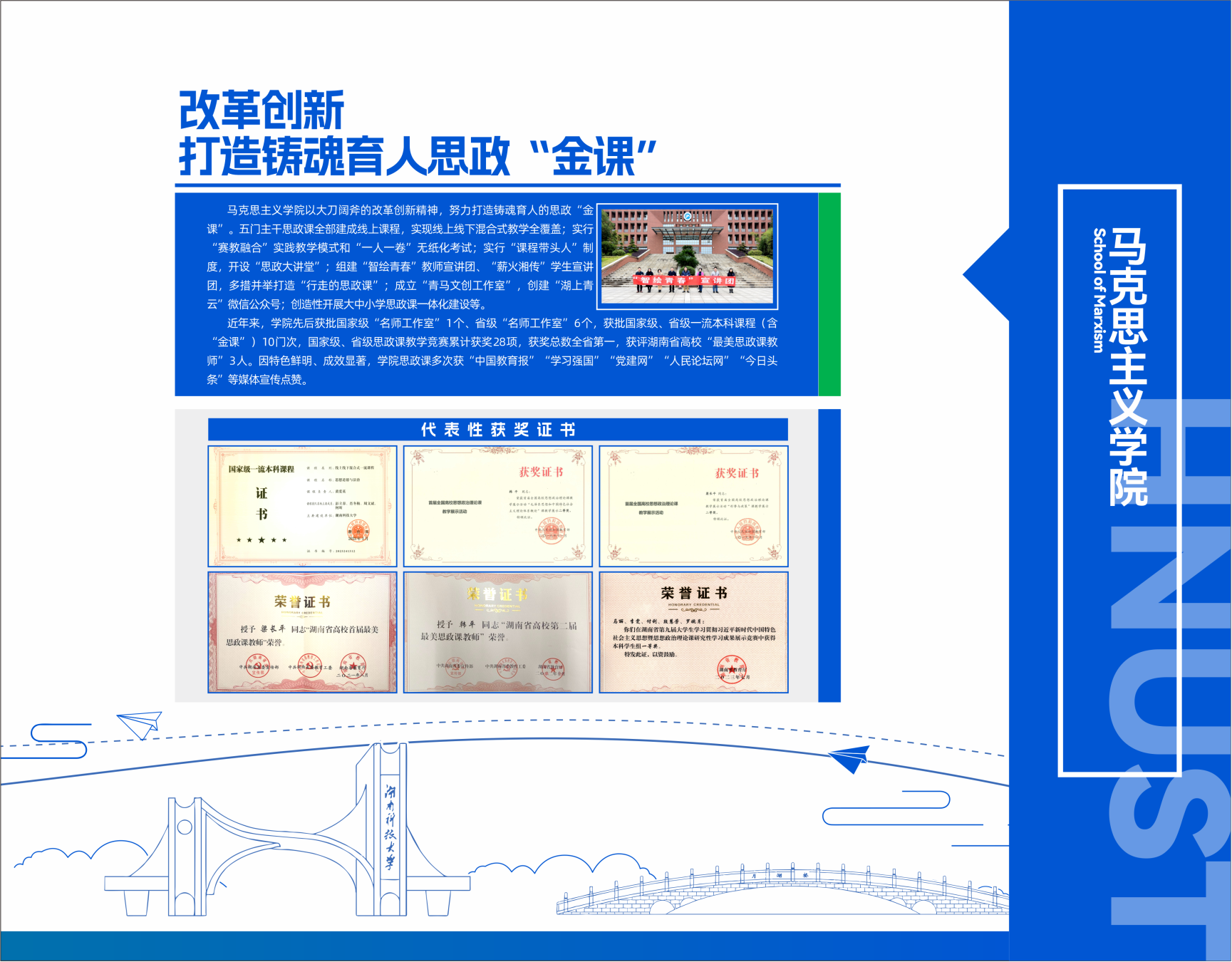 先后获批国家级“名师工作室”1个、省级“名师工作室”6个,获批国家级、省级一流本科课程(含“金课”)10门次,国家级、省级思政课教学竞赛累计获奖28项(获奖总数全省第一),获评湖南省高校“最美思政课教师”3人。因特色鲜明、成效显著,学院思政课多次获“中国教育报”“学习强国”“党建网”“人民论坛网”“今日头条”等媒体宣传点赞。