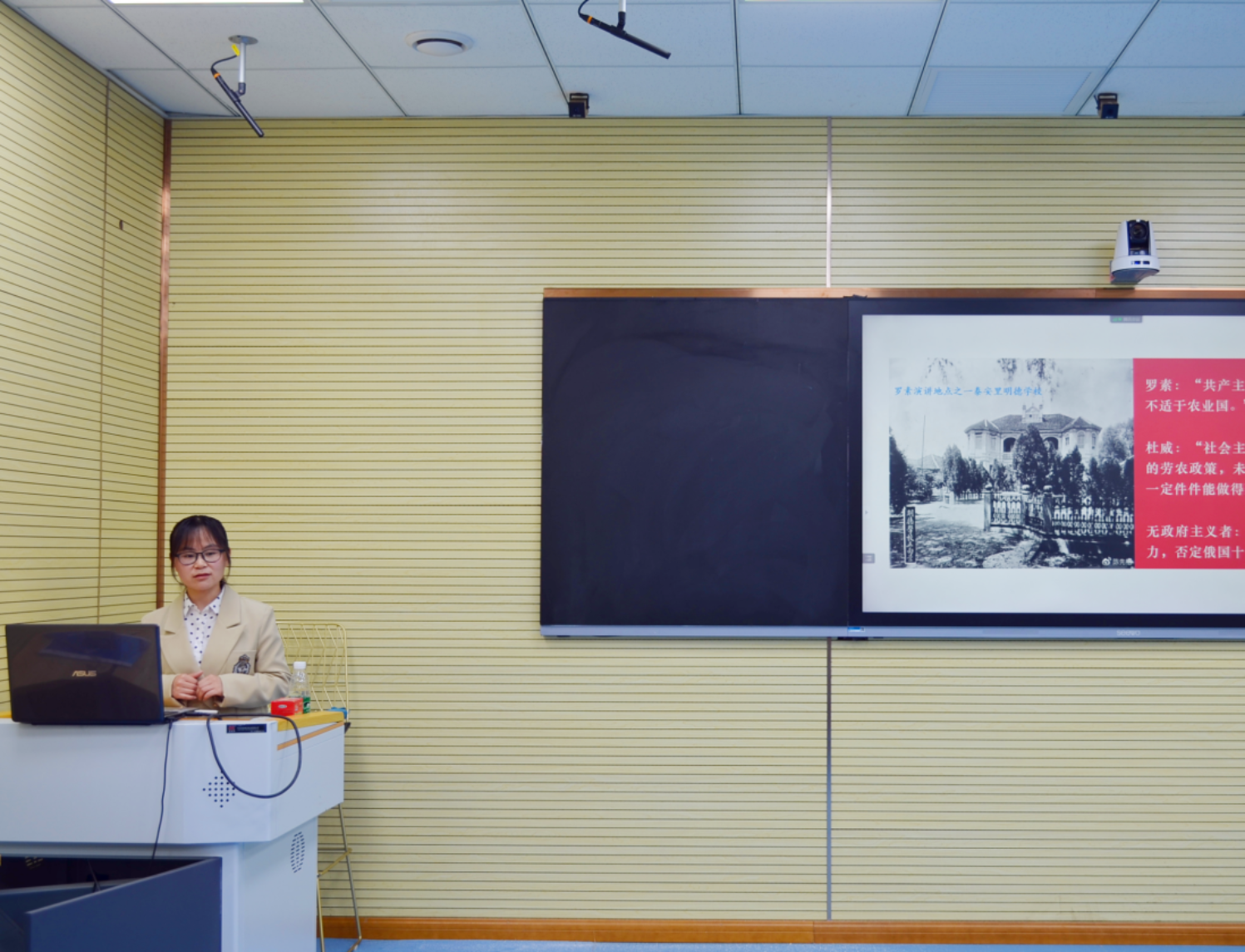 接下来由三校教师分别做教学展示。我院岳梅博士结合《中国近现代史纲要》教材,在充分挖掘湖南的红色文化特色基础上,讲授了“五四时期马克思主义在湖南的传播”。从“成立进步团体与书社”“创办进步刊物”“建立新式学校”“与反马克思主义思想论战”“创建无产阶级党团组织”五个方面介绍了五四时期马克思主义在湖南的传播活动,带领学生思考与回答了“为什么湖南是马克思主义传播最早、影响最大、马克思主义者人数最多的省份之一”。拓展了纲要课的理论深度,增强了纲要课教学的思想性、政治性和时代性。