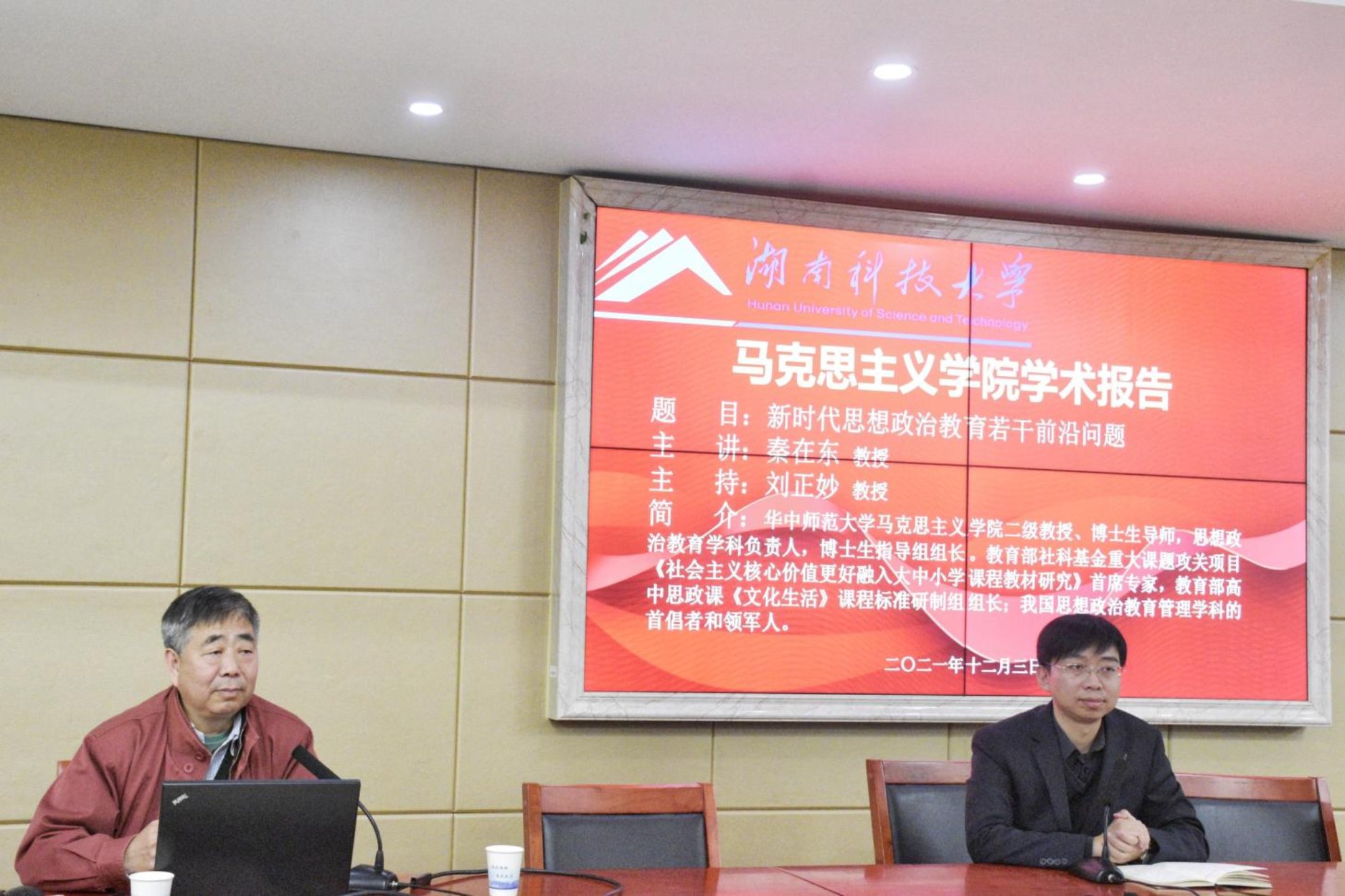 12月3日,华中师范大学永利yl23411思想政治教育学科负责人、博士生指导组组长,我国思想政治教育管理学科的首倡者和领军人秦在东教授应邀来我院作题为《新时代思想政治教育理论发展战略》的学术报告。报告会在永利yl23411立言楼A5-1报告厅举行,由我院党委书记刘正妙主持,我院部分教师和在校硕士研究生、博士研究生认真聆听了此次报告。