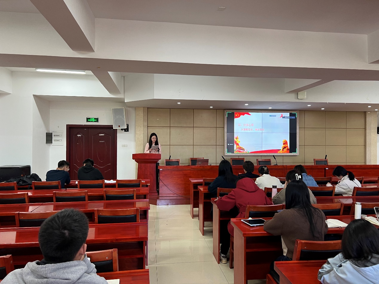 研究生第四党支部王欢同志在分享学习心得时表示,党员同志要强化思想淬炼,坚定理想信念,将学习贯彻习近平新时代中国特色社会主义思想作为根本任务,深入学习贯彻习近平总书记系列重要讲话精神,不断增强“四个意识”、坚定“四个自信”、做到“两个维护”。在生活和工作中,我们要认真履行好自己职责,恪尽职守,甘于奉献,坚持把纪律规矩内化于心,从自身做起,注重党纪法规常态化学习。