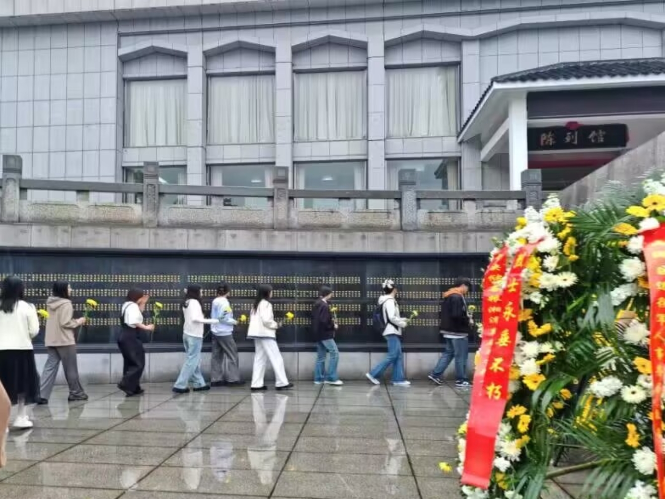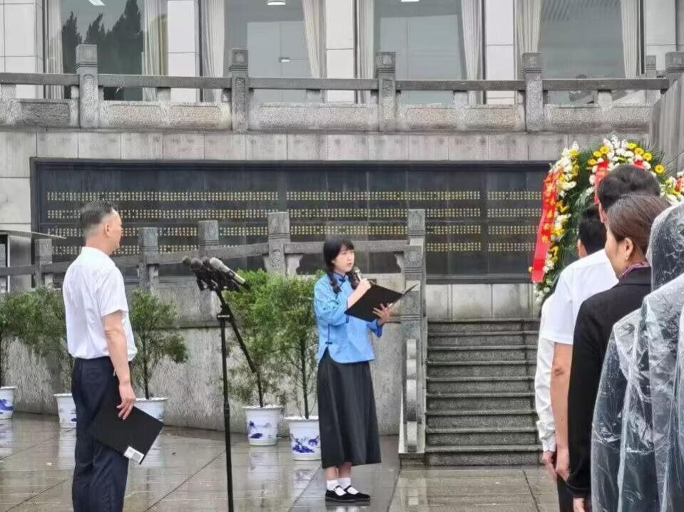 烈士陵园纪念碑广场上全体人员肃立,一同奏唱国歌,全体人员向革命烈士默哀致敬。随后,我院“薪火湘传”宣讲团成员师雪阳同学深情诵读烈士书信,表达对先烈的深切缅怀之情。