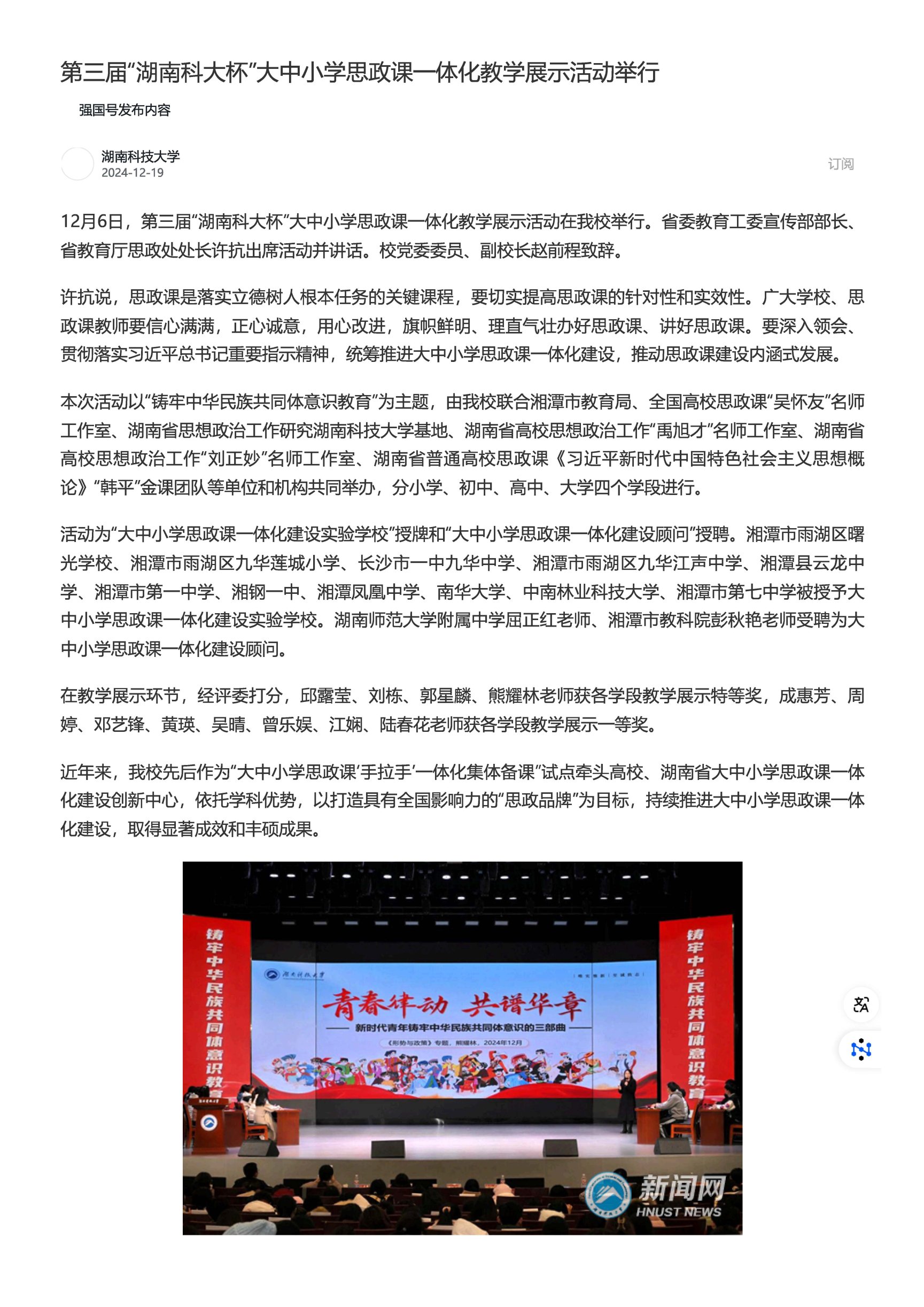 【学习强国】第三届“湖南科大杯”大中小学思政课一体化教学展示活动举行