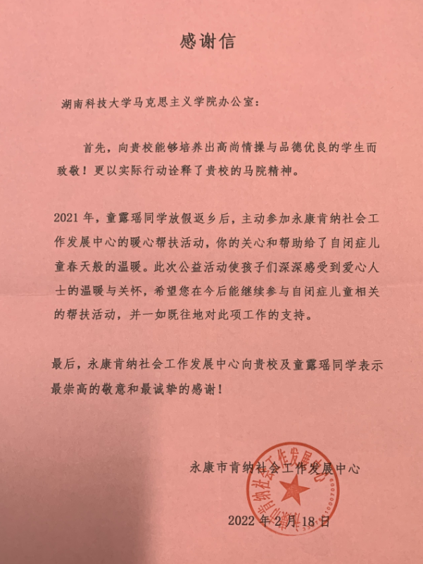 永利yl23411学生工作办公室于2022年2月底收到了浙江省永康市肯纳社会工作发展中心对童露瑶同学的感谢信。永康肯纳社会工作发展中心在信中向我院及童露瑶同学表示崇高的敬意和诚挚的感谢。信中写道,童露瑶同学在志愿活动中陪伴自闭症的孩子们,和她们互动引导,给予了他们春天般的温暖,此外,她利用节省下来的生活费给孩子们捐赠文具用品。为了更好的接触孩子们,童露瑶同学提前做好有关自闭症儿童特点的笔记。