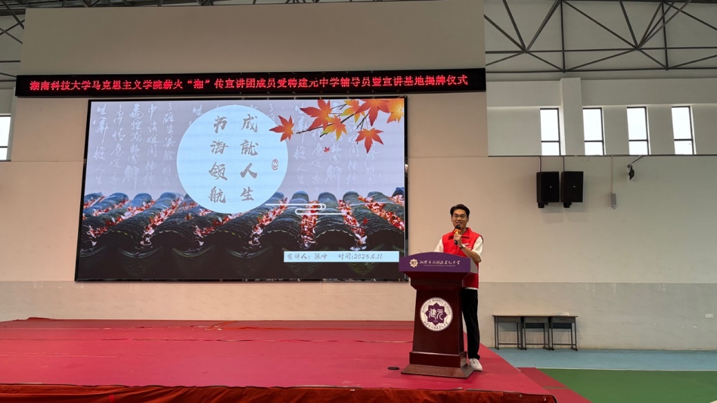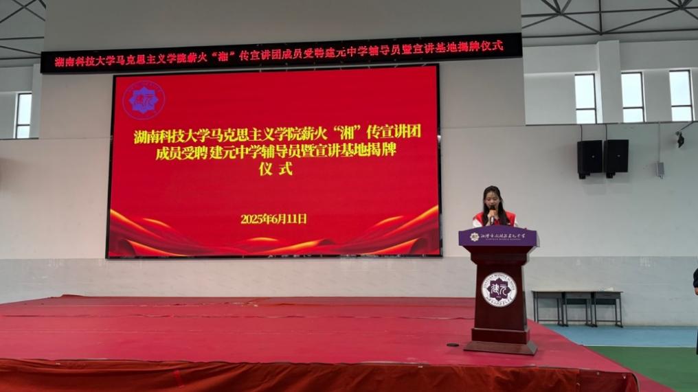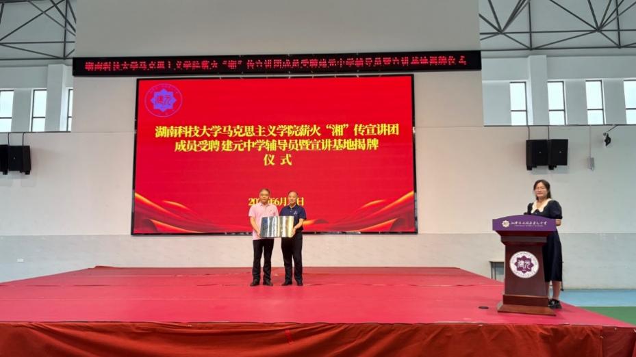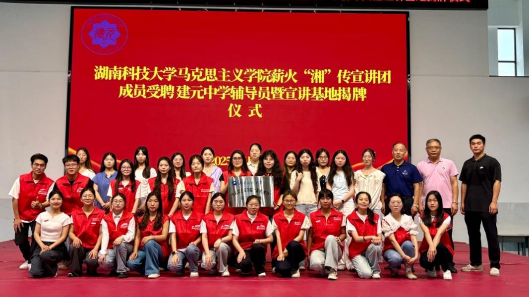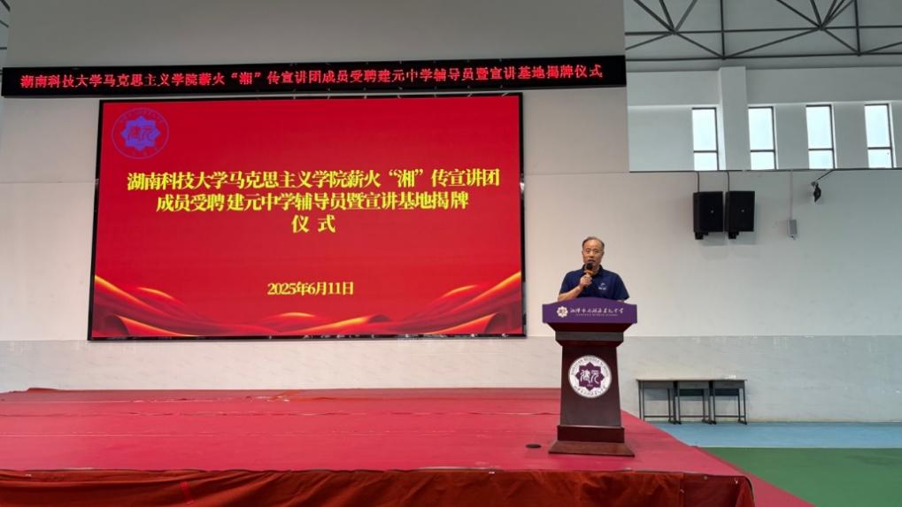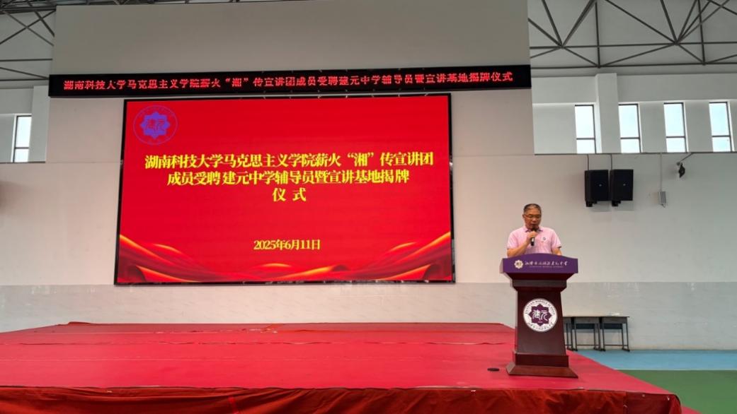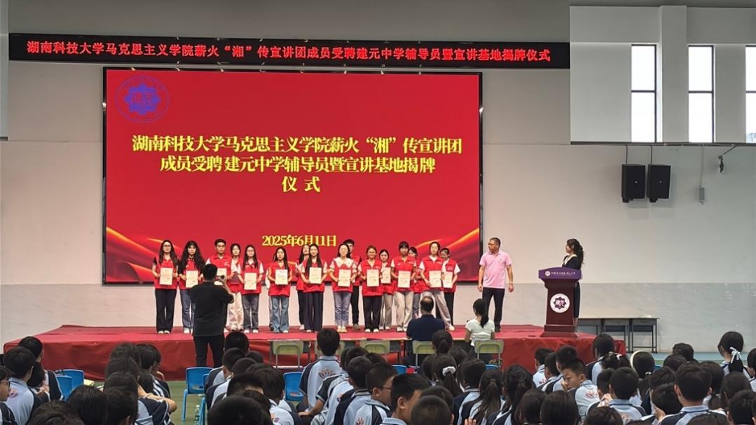 2025年6月11日,在湘潭市建元中学举行了一场意义非凡的活动,我院“薪火湘传”宣讲团成员正式受聘为建元中学的挂职班级辅导员宣讲基地揭牌仪式顺利举行。院党委副书记刘图其、院团委书记罗娜,建元中学党支部副书记梁小松及七年级11个班级师生共同见证这一历史性时刻。
