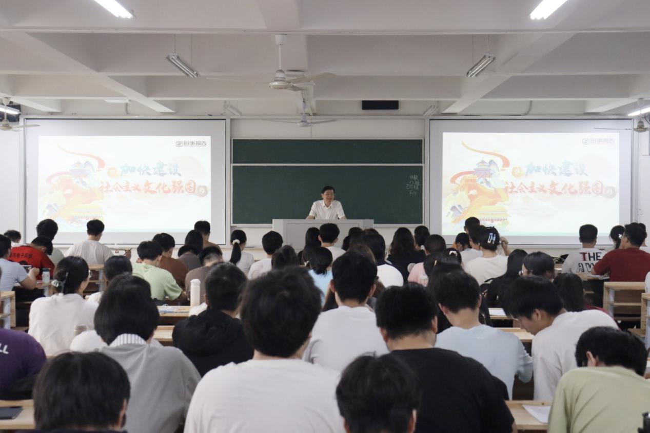 6月11日下午,校党委委员、副校长王卫军在第八教学楼608教室为2022级物理专业学生讲授“形势与政策”课,主题为“加快建设社会主义文化强国”。
