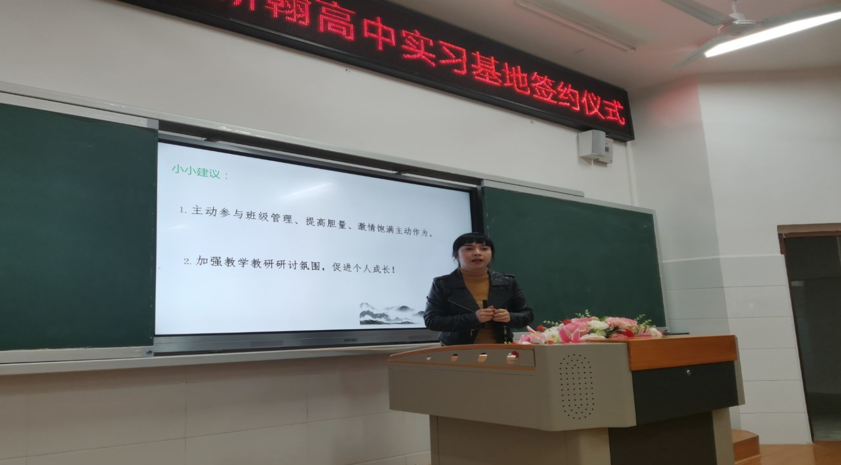 班主任代表奉先焱老师对20名实习教师这33天的班主任工作进行了总结。奉老师指出实习老师们年轻有为,积极出色,不论是清晨的跑操、夕阳西下的时政课还是晚间的学生宿舍都有实习老师早起晚归的身影;从一开始的腼腆羞涩到现在的落落大方,从面对学生问题时的手足无措到现在的轻松应对,所有这些,无不体现出了实习老师们成长的迅速。