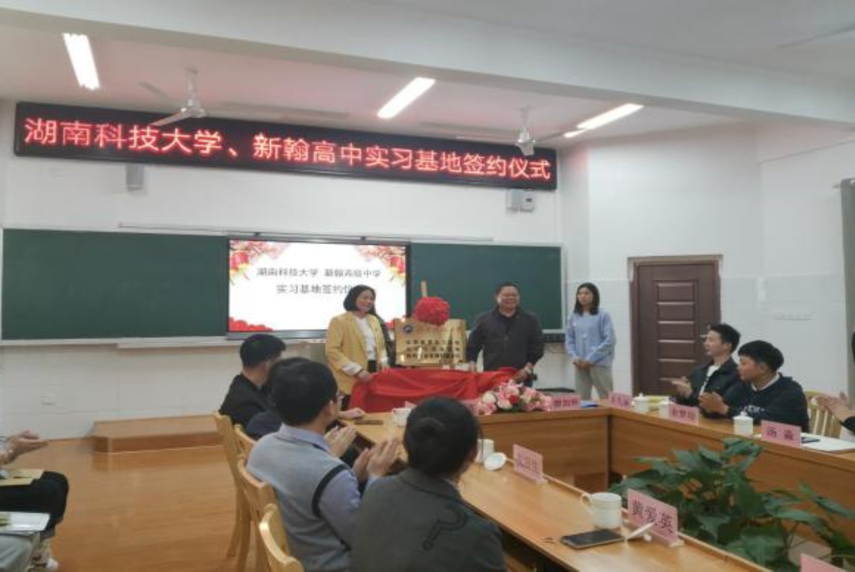 会议最后,我院党委书记廖加林教授与新翰高中商南花校长在两校实习基地协议上签字,为实习基地揭牌并合影留念;双方领导都表示将来要加强两校的深入交流,互相学习借鉴成功经验。