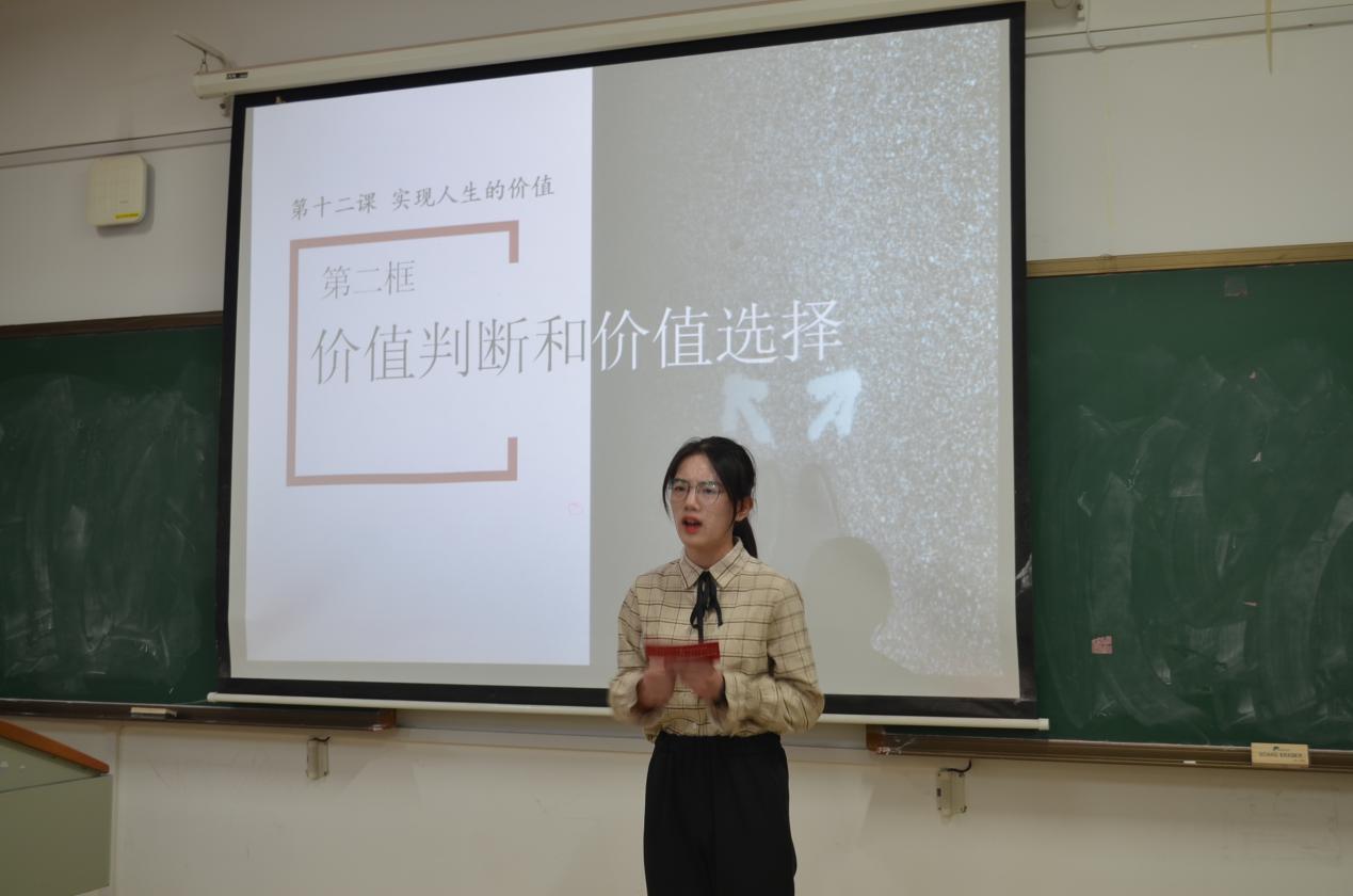 本次比赛在主持人激情的开场白中拉开序幕。参赛的选手按照抽签的顺序登台展示,在完成教育问答后,每位参赛者进行10分钟的片段教学展示。参赛者陆甜甜用疫情防控期间志愿者们奋勇向前、我行我上的报道引入课题“人的价值”,凭借扎实的教学基本技能和趣味生动的讲课,赢得了台下评委与观众的热烈掌声;罗思琪则凭借精简的PPT演示和自信流畅的口头表达,将“正确对待外来文化”这一课题演绎得生动形象;肖琪在教育问答环节中对“好老师的标准”发表了自己的独到见解:一名优秀的老师应该有爱、有德、保持学习;向桢芹在讲述“价值判断与价值选择”这一课题时,采取“议事大会”的形式,分正反两方对“要不要承办奥运会”这一问题进行讨论,从而衔接到所教授的知识点,形式新颖、活泼。